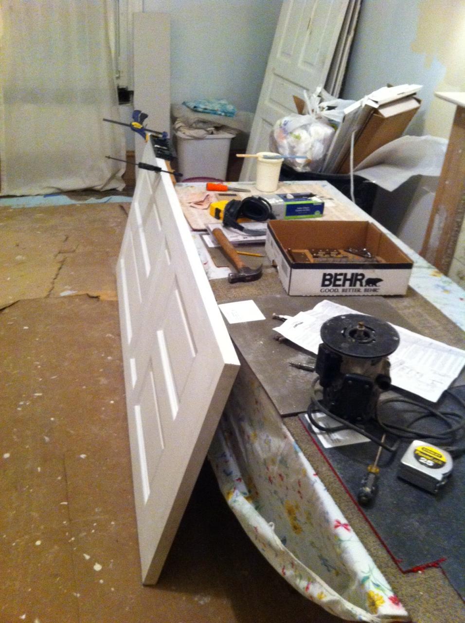 This is the door we added height and width to, so the next step was to route out the hinges in our living room workshop. This is way clean, btw: