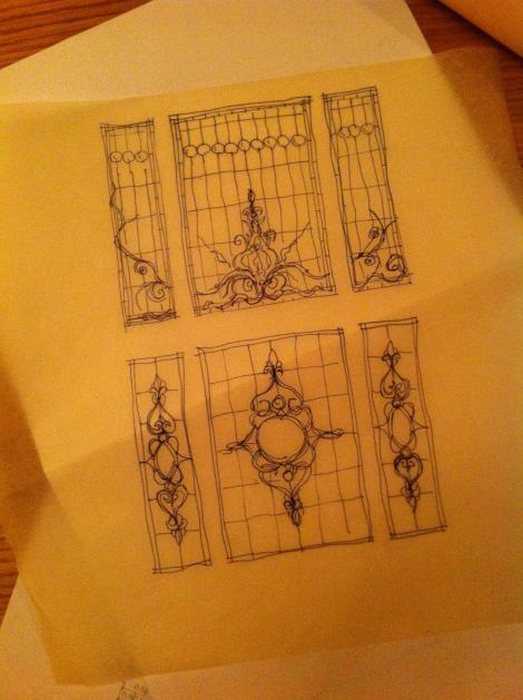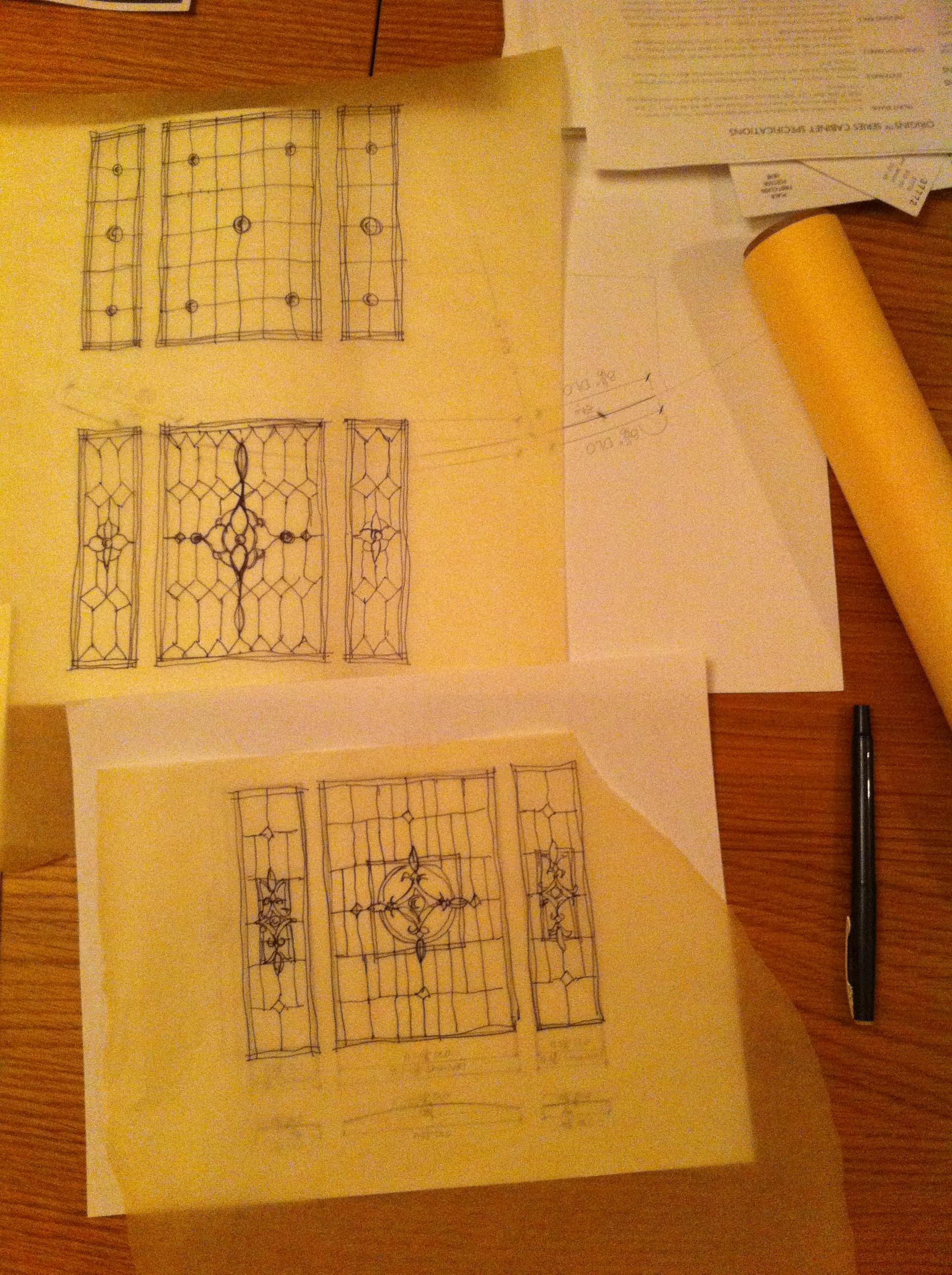 I’ve read through the posts and marveled at the drawings for the stained glass because this is *exactly* what I am looking to do for one set of windows, plus a 4′ circular window and half circle transom above our front door!! The style is perfect and I lo e the details! I kept getting stalled at trying to find some that were salvaged vs. hiring someone who I thought was able to do the job well.
