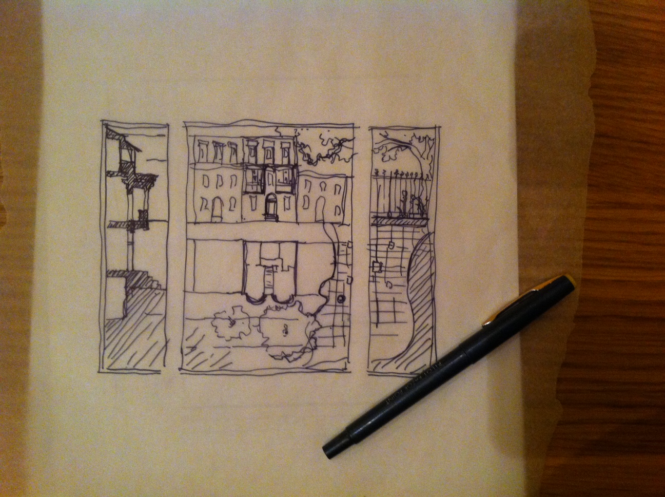 We each worked on a ton of designs, trying everything that came to mind- floral Victorian to Greek inspired to heady transcendentalism to a map of the world; in architect speak it was a whole lot of thumbnail concept sketches.