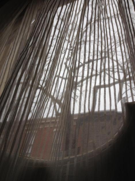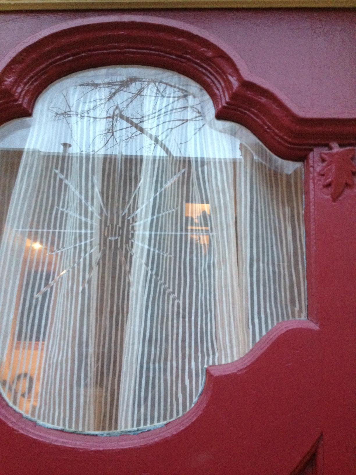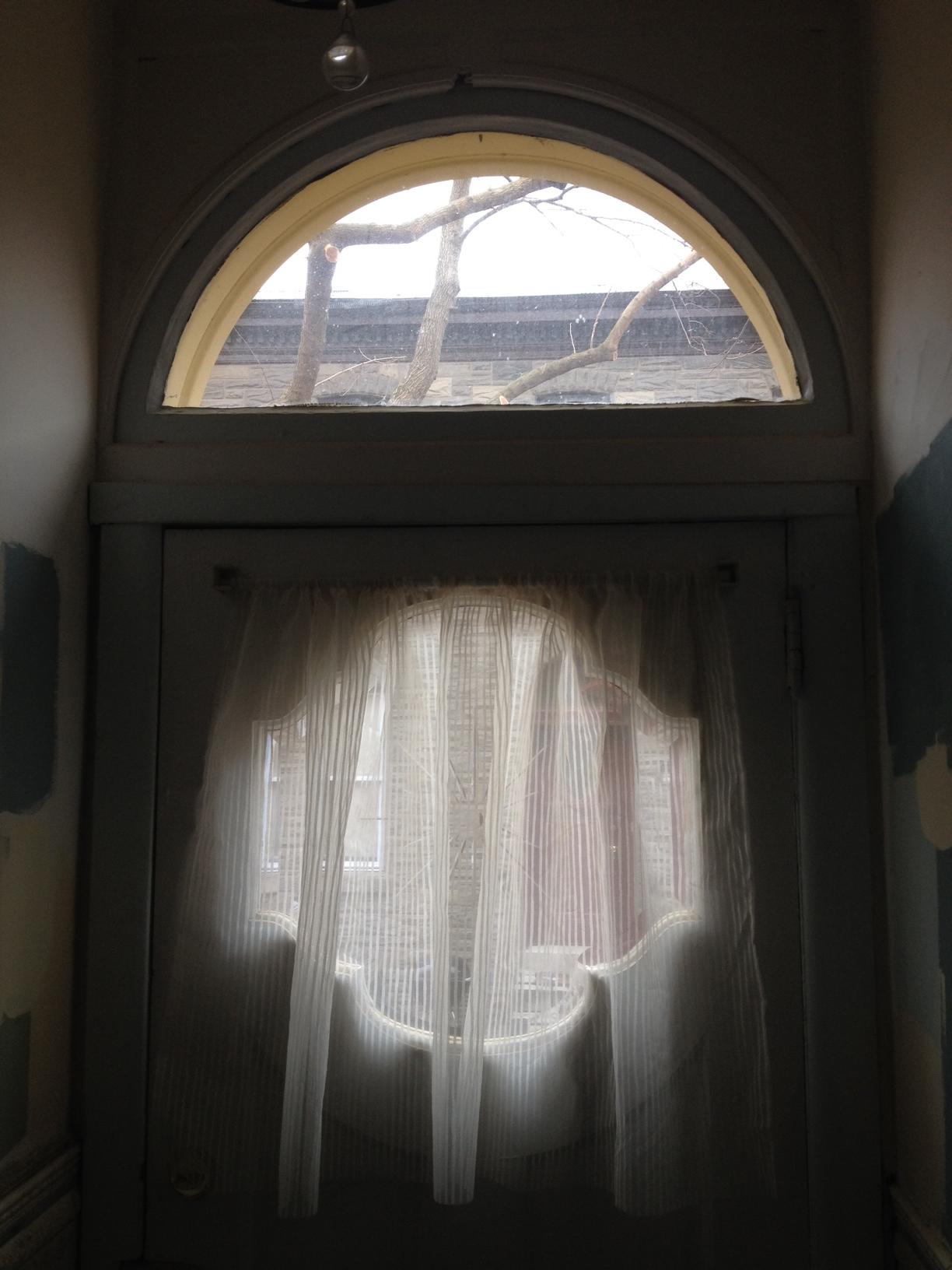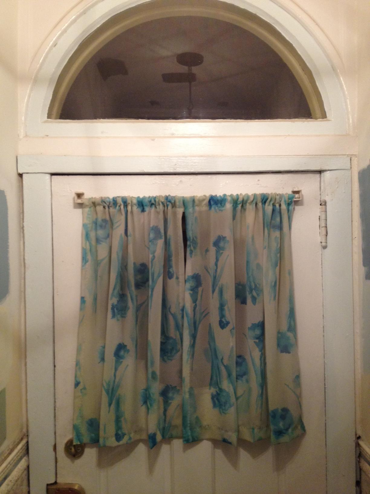 Our front door has been wearing the same floral blue sheer curtain since we moved in. We happened to have a perfect size scrap of sheer from hemming our curtains in the guest bedroom: