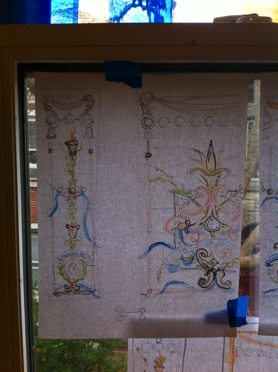 Checking out the window with sketches pinned up: