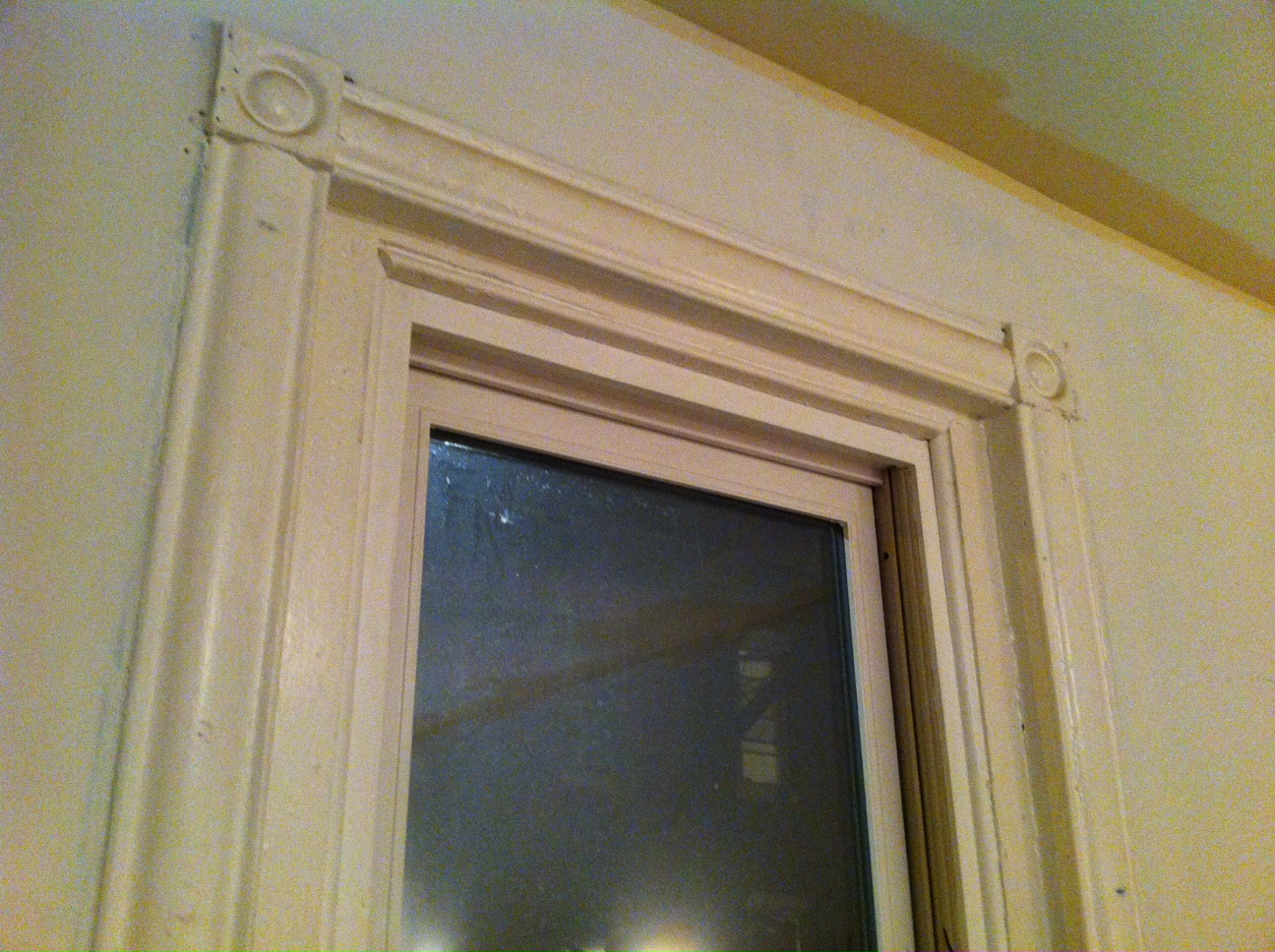 At some point the plaster walls were laminated over with new drywall burying the sides of the trim, so we need to remove the old and bring the trim forward.