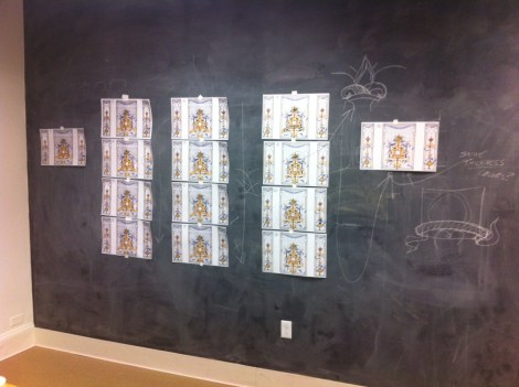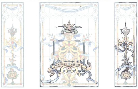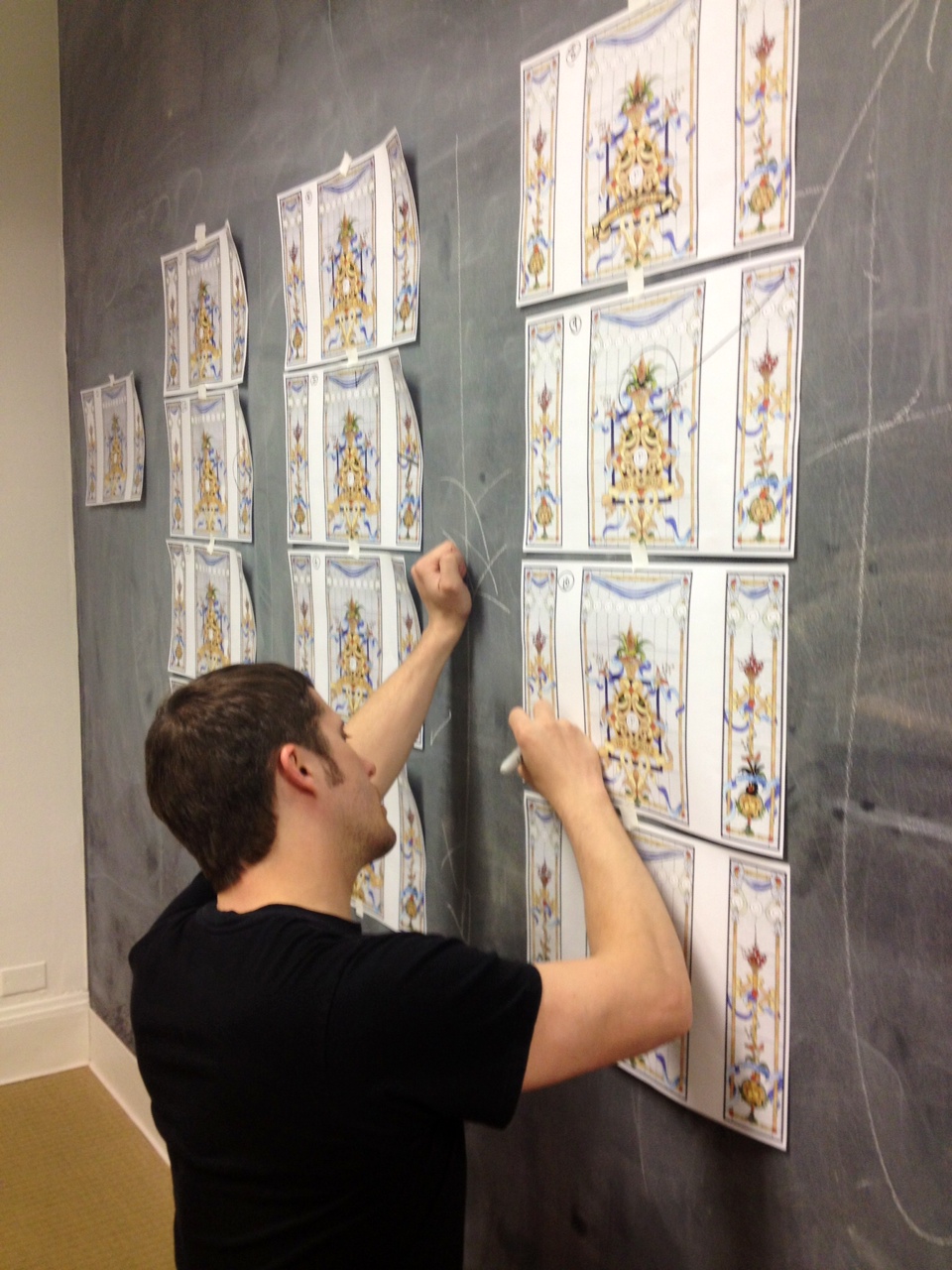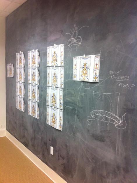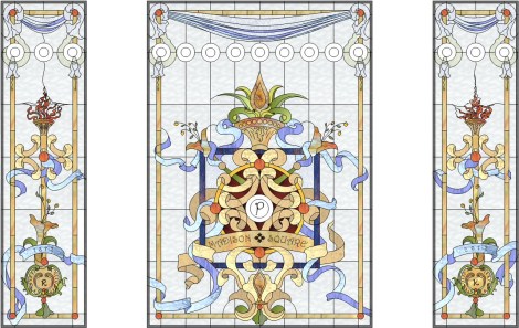 McElf has sent us over a dozen versions of our window in the last few days tweaking and perfecting each element… getting the blue ribbons just right, adjusting the size of the torch, adding more to the center supporting element, etc