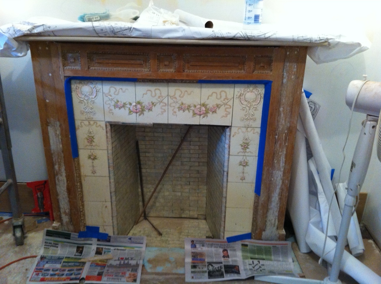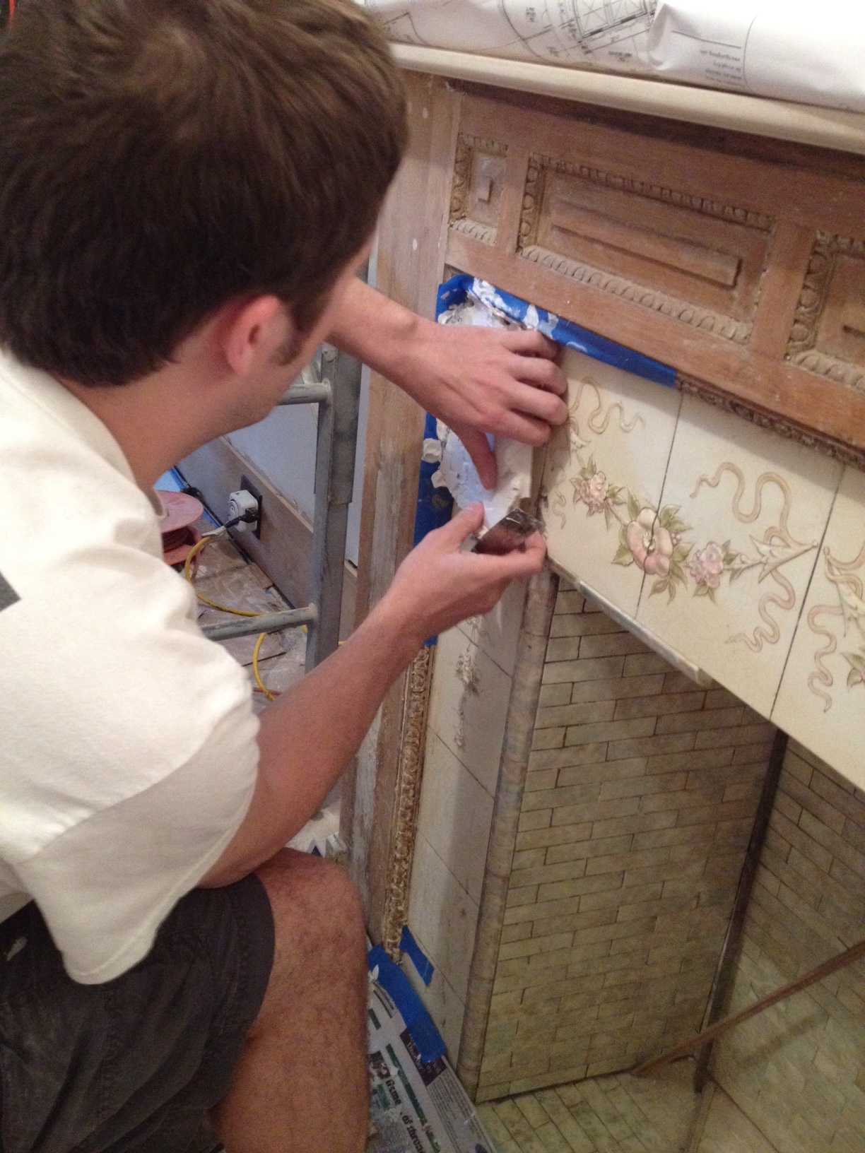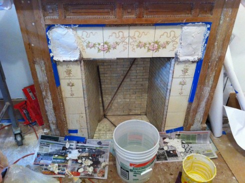 As you may know, we incorporated the seashells from our living room fireplace mantel into the new stain glass window design. So as an extra challenge we are going to cast a mold of the actual tile to help McElf cast new shells in glass for the window!