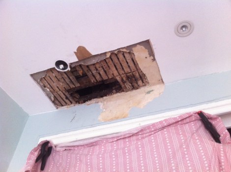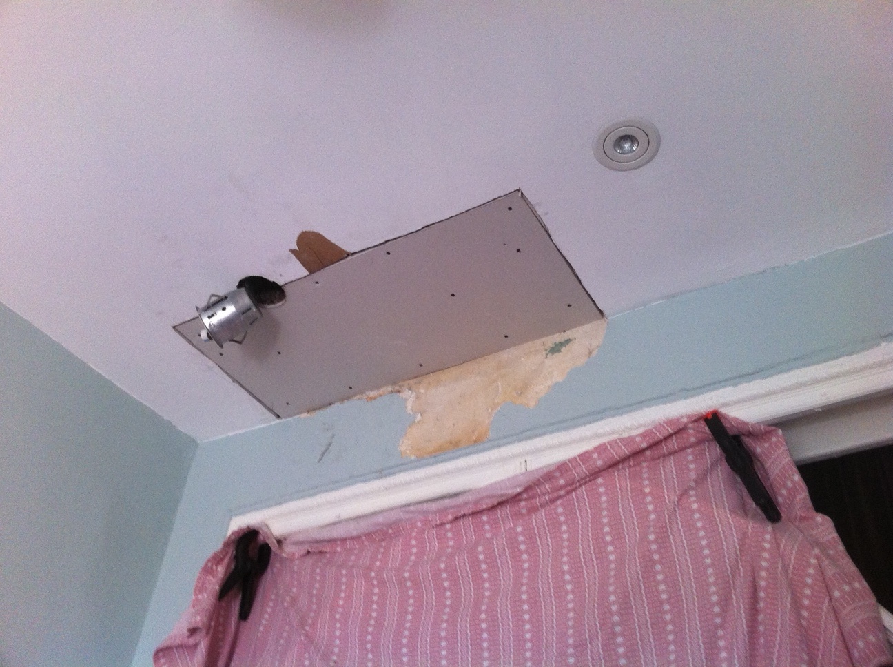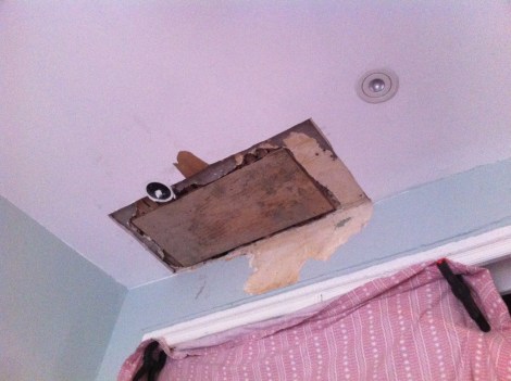 Well we fixed the leak right away but the gaping hole in our bedroom ceiling from where we cut out the wet drywall and plaster stuck around for a bit longer… and it is time for it go away.