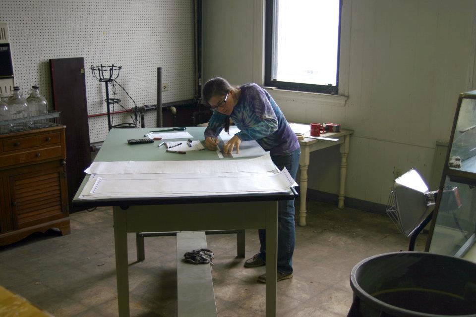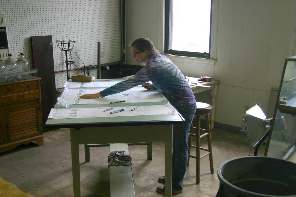McElf working in her studio on the cartoon, aka the full size pattern. What a great drafting table!
