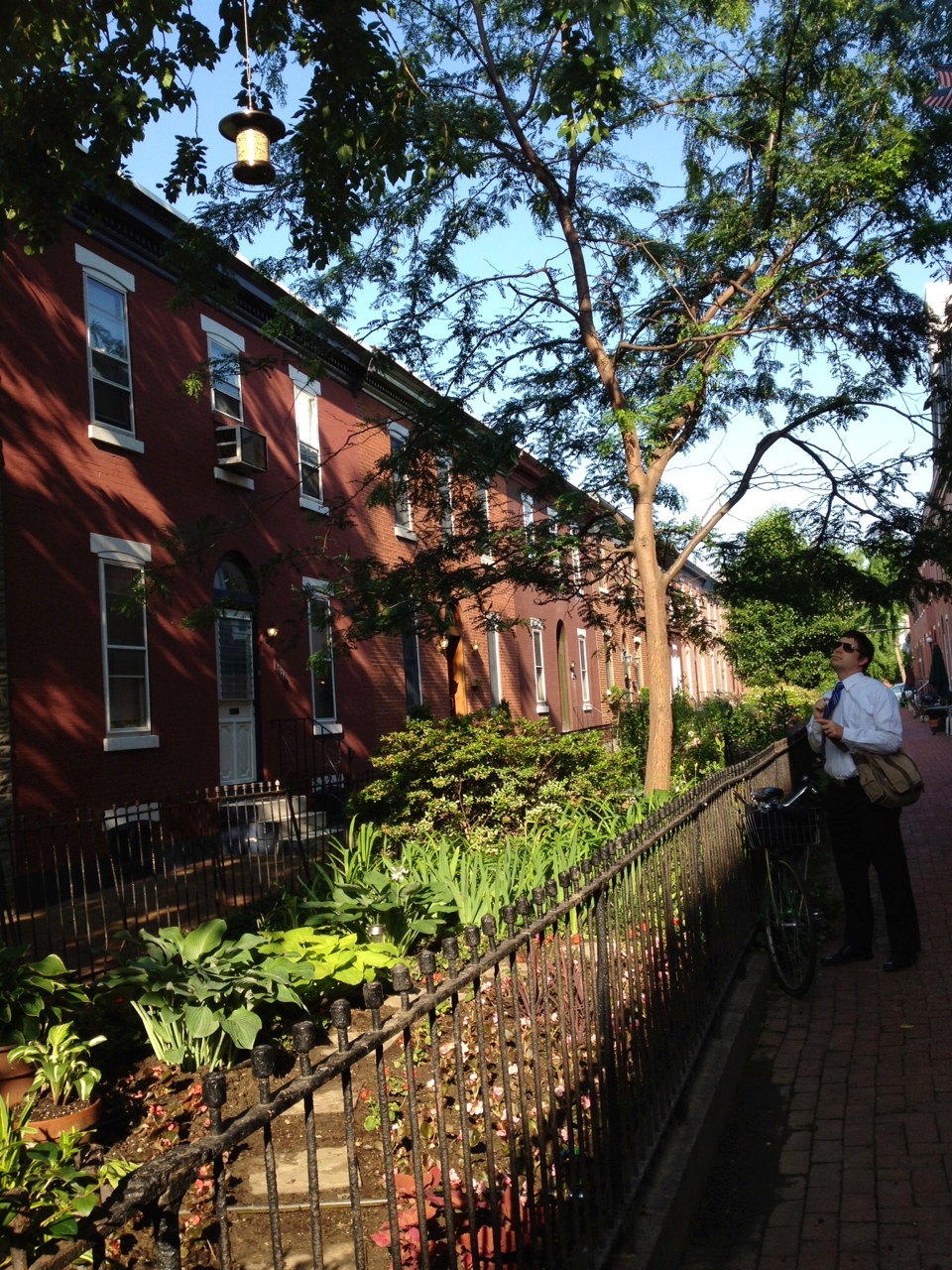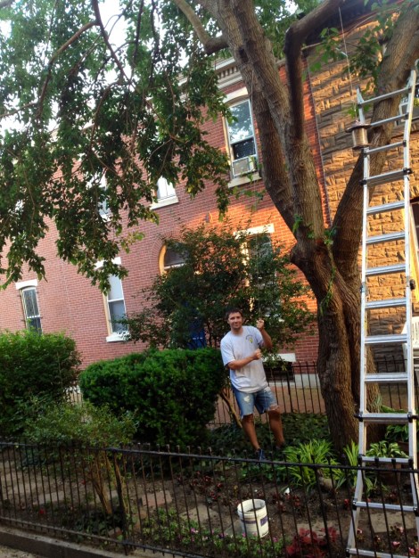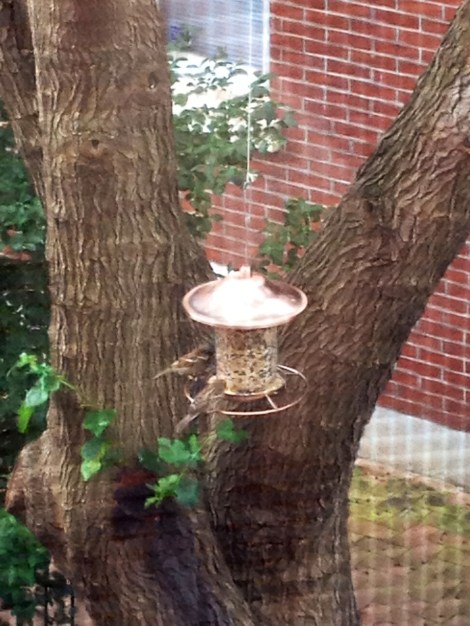 BUT it was bound to be discovered eventually. This morning, two cute birds discover Graduate Hospital’s newest bird bistro (as seen thru the window screen with the wildlife zoom lens of my phone):