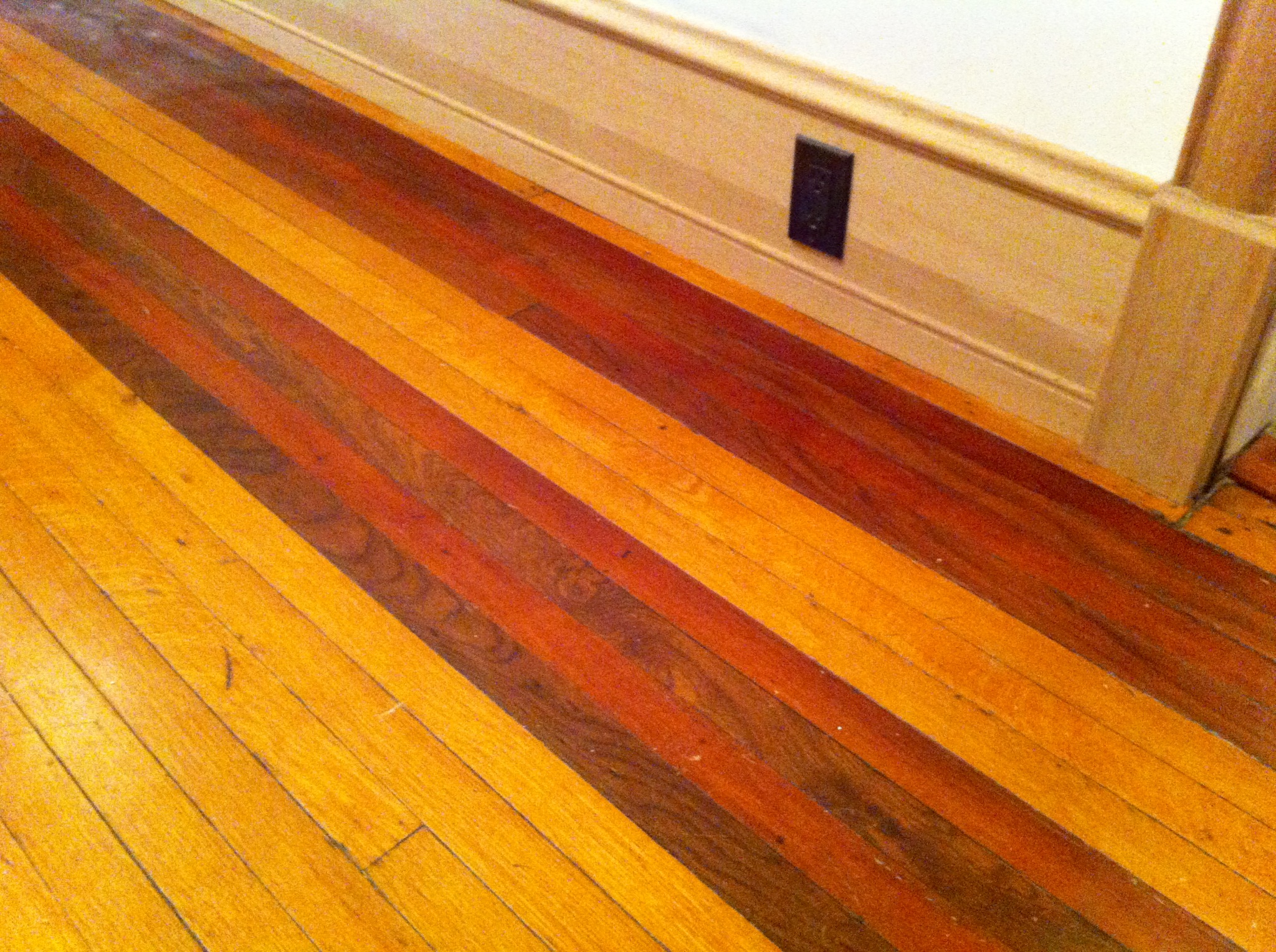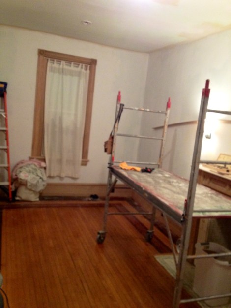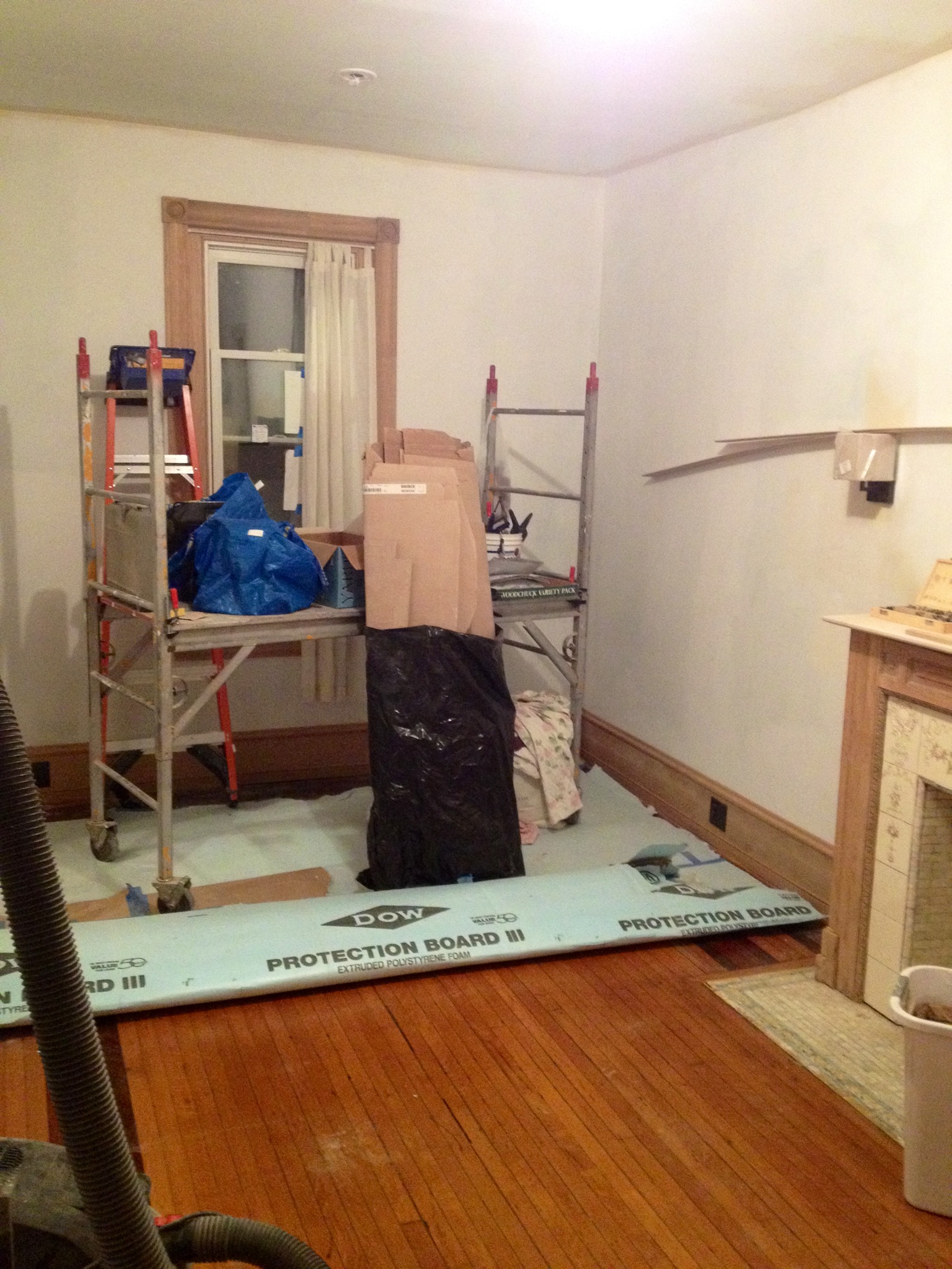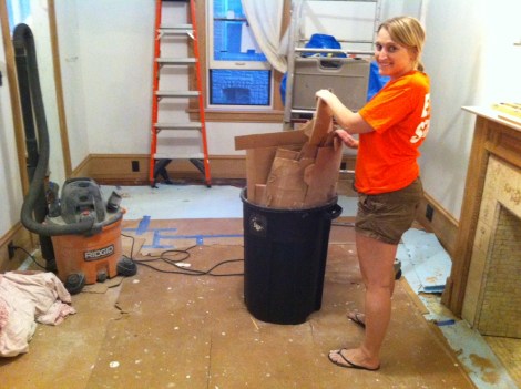 Serious work. We put the protective blue foam board down the first weekend after we bought the house in August 2009 and it hasn’t been up since. Then we started layering cardboard on top as we had it until we were convinced the floor wasn’t getting dented when we tossed tools around. So: Lots Of Layers. Mid way: