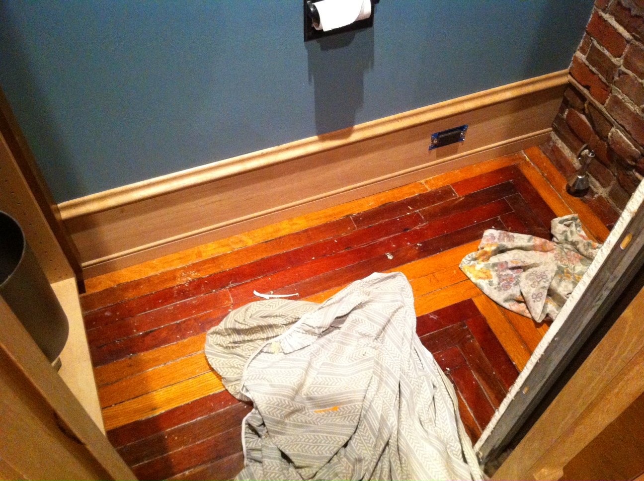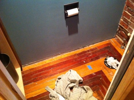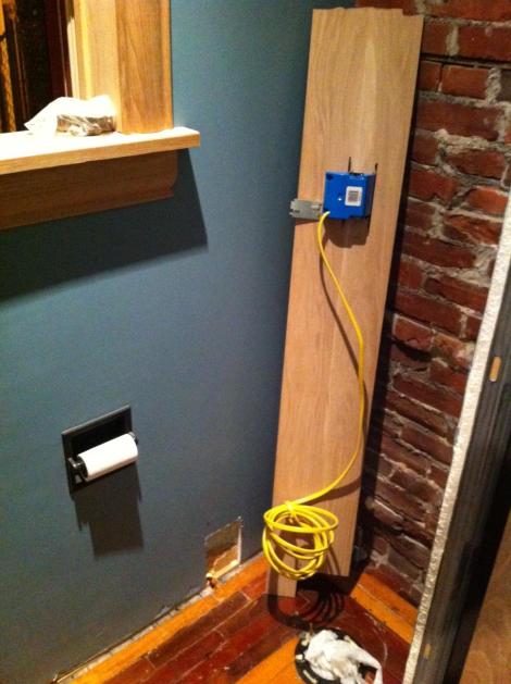 Never too late to make changes… Rob decided that we needed to add an outlet to the bathroom baseboard. The stars aligned, we had all the parts we needed and I sighed and continued poly-ing.