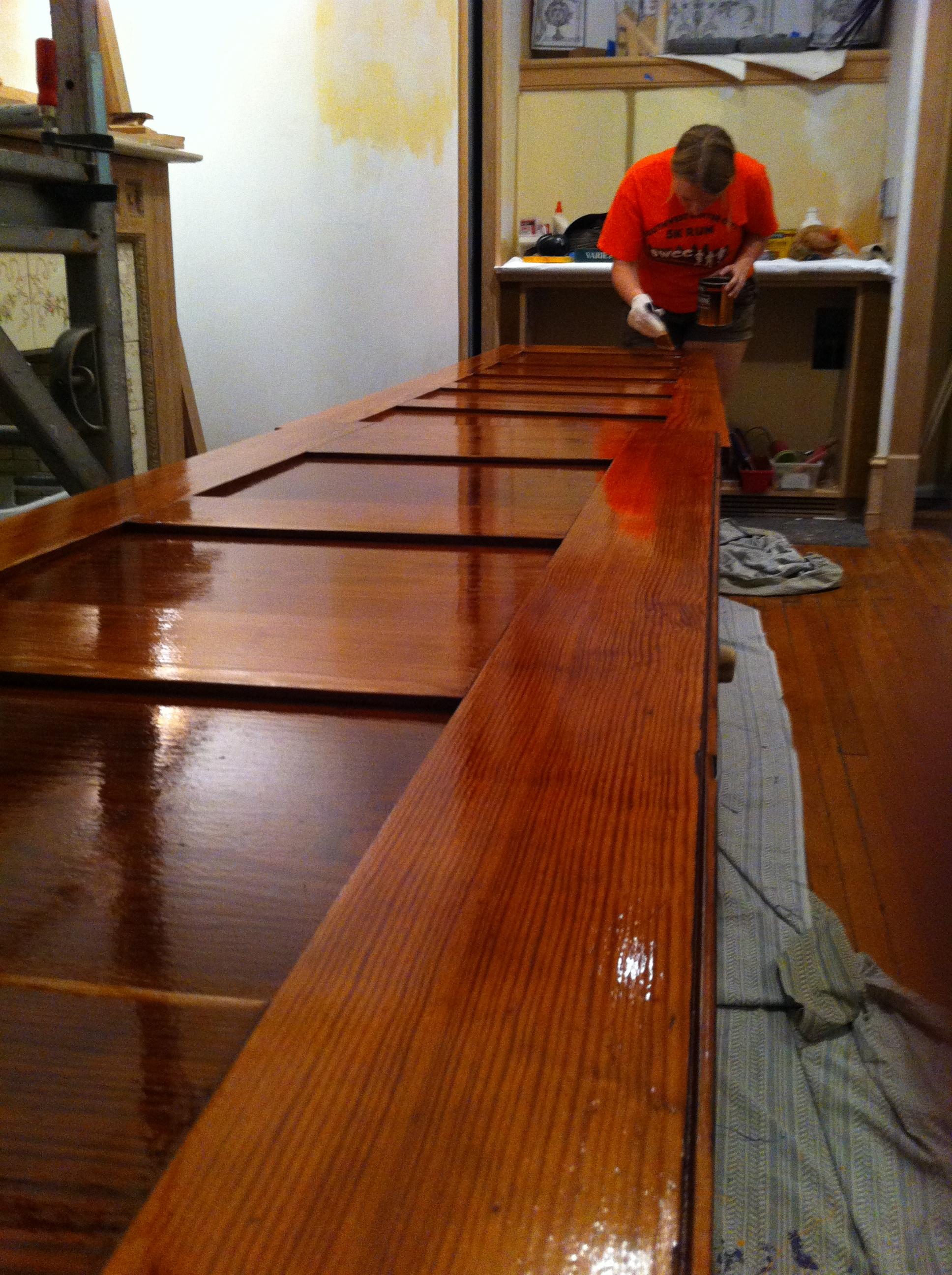 Okay, so nice floors but we’re not done yet. Brought the doors inside for the 3rd coat of poly: