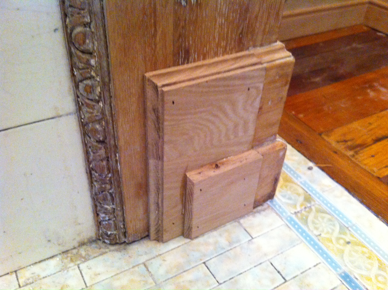 So that history has left us with some unfinished looking trim like this base. We are not going to create the pilasters but want the mantle to still look complete. So we mocked up several ideas which you can see two of them above.
