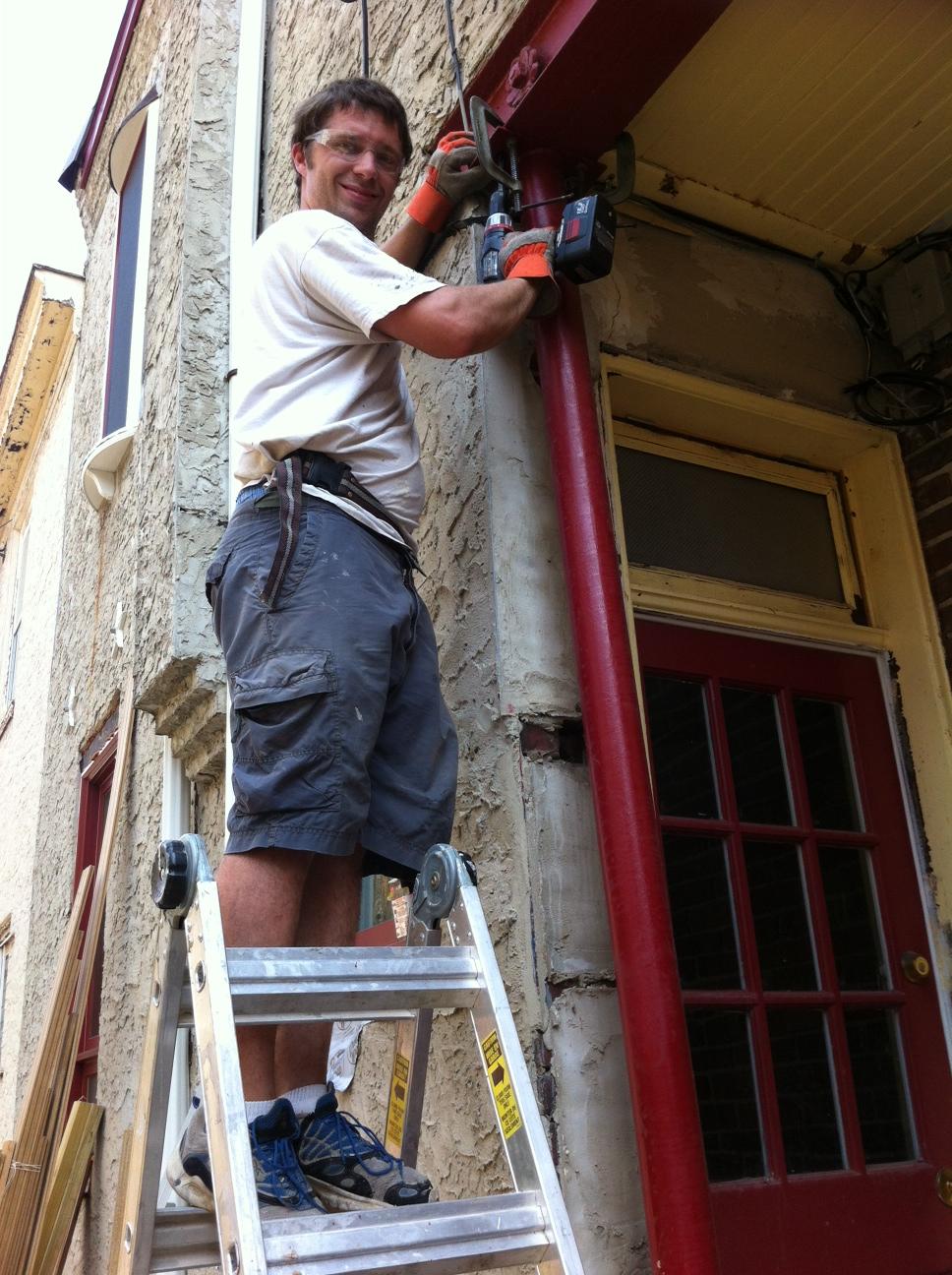 So here’s the story on the new column. A lot of load from the 2nd & 3rd floor comes down on the steel beam that spans our back porch area. Then half that load rest on a small masonry pier between our back door kitchen window. Well let’s just say when we had the walls opened up during the kitchen renovation the masonry in the corner didn’t look too good. We patched up the masonry from the inside but also decided at that time that when we redid the back porch area it won’t hurt to add a column for some additional support… So here we are today.