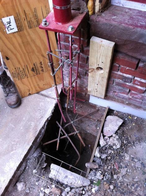 The column was given to us by Kelly’s Dad since he did not need it. Unfortunately it was too short so we added a concrete pier to make up the difference. The anchor bolts will hold the column in place and the rebar will help hold everything together. The bar is also tied back to the brick to give it some more support.