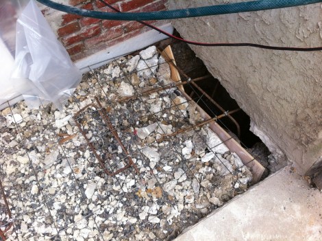 We then worked on installing rebar in the footings. Yes plural. At the other end of the porch we discovered the masonry wall was just sitting on the 4″ concrete slab with no footing! The wall