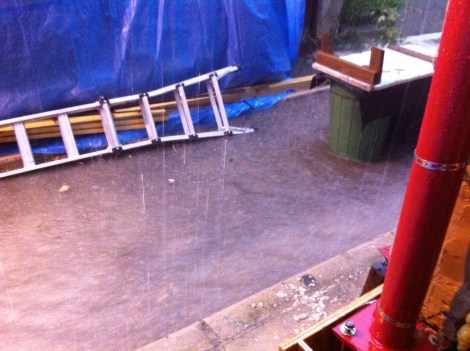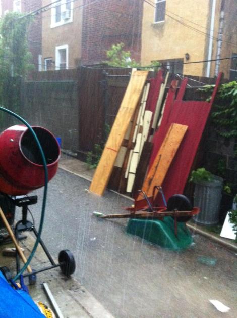 Of course what happens as soon as we are ready to mix concrete? It pours rain! We quickly covered all the bags of concrete with a blue tarp, so hopefully they all make it through…