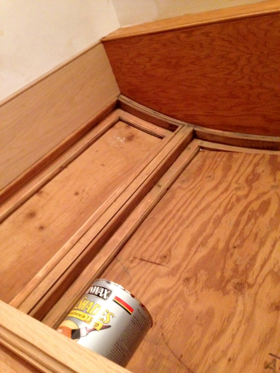 The living room trim is officially stain/poly-Ed! I also started the clear coat but didn’t get too far yet. We’re loving the finished look of the room and are so excited to paint. We did the poly first because we didn’t want any wayward paint to get into the unfinished grain of the wood trim. East wall before: