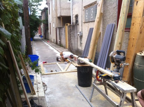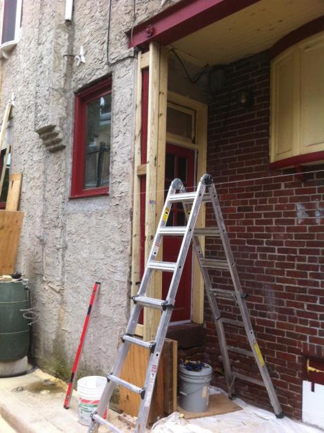 We started the day with a supply run that of course took forever as usual. Then we had to run out again for about an hour and in that time a scrapper must have come up the alley and stole our gate track!!! Yes the key item that holds the whole thing up that is hard to get! They also made off with our gutters that were down for the stucco work and the extra rebar! Ugh … They usual come around the day before trash day picking through so we had placed the material under some plywood. Obviously they still found it… So that was a real downer for the day.
