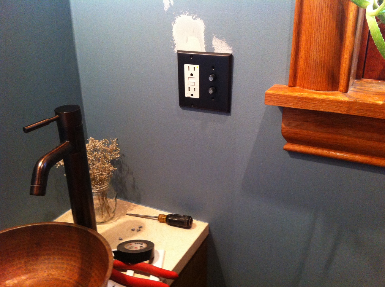 And the cover plate is oil rubbed bronze to match the rest of the hardware. I still need to pick up a black GFI to replace the white one, but we are really close!