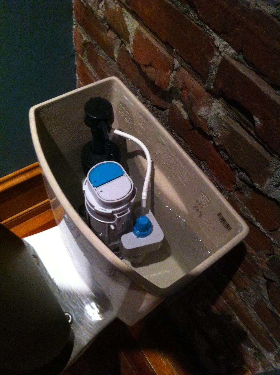 So this is what a dual flush mechanism looks like. The blue button is the half flush which drops the stop once about half the water leaves the tank.