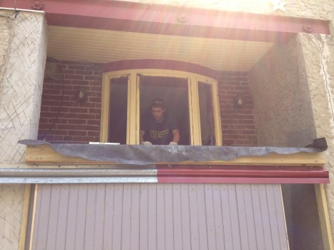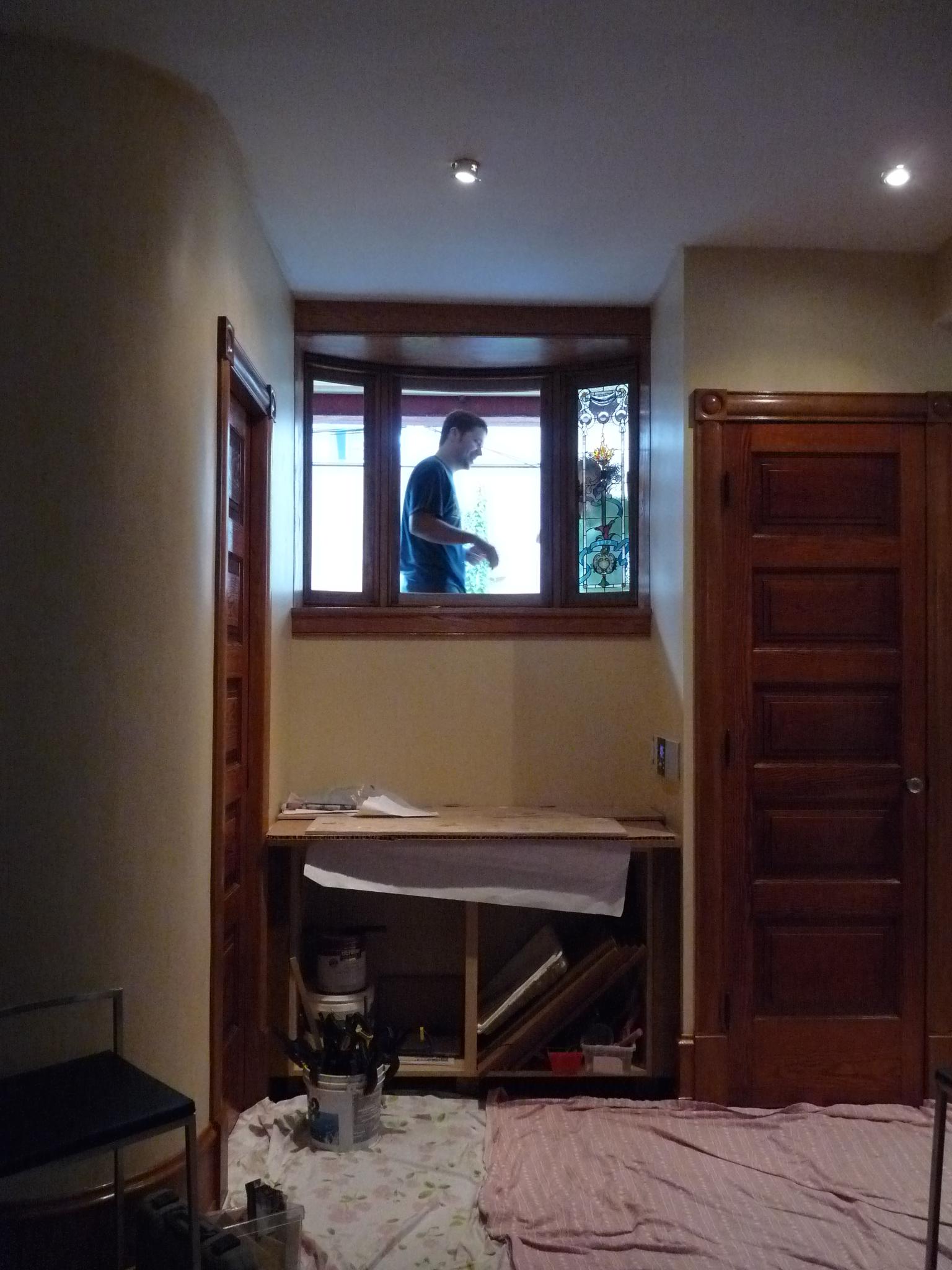 Then fast forward to now, everything is finished around the window but the plywood from whenever the glass was removed was still in. The little streak of light at the top is from where I started removing the trim holding the plywood in.