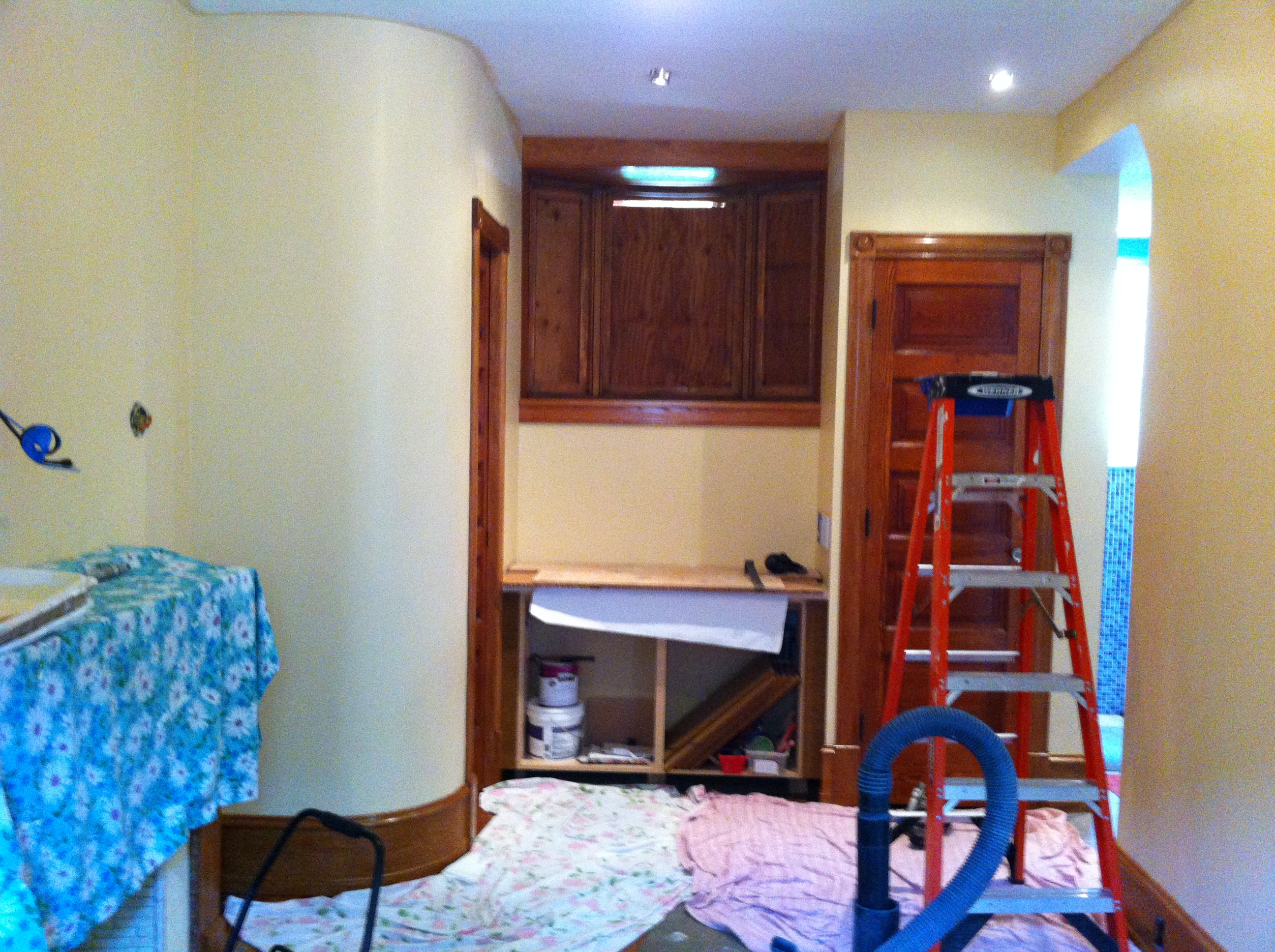 Let’s start with the before and afters. Believe it or not this is the same room, the photo was taken when we bought the house. No window, half bath, credenza, closet, opening to kitchen, stained oak trim, etc…