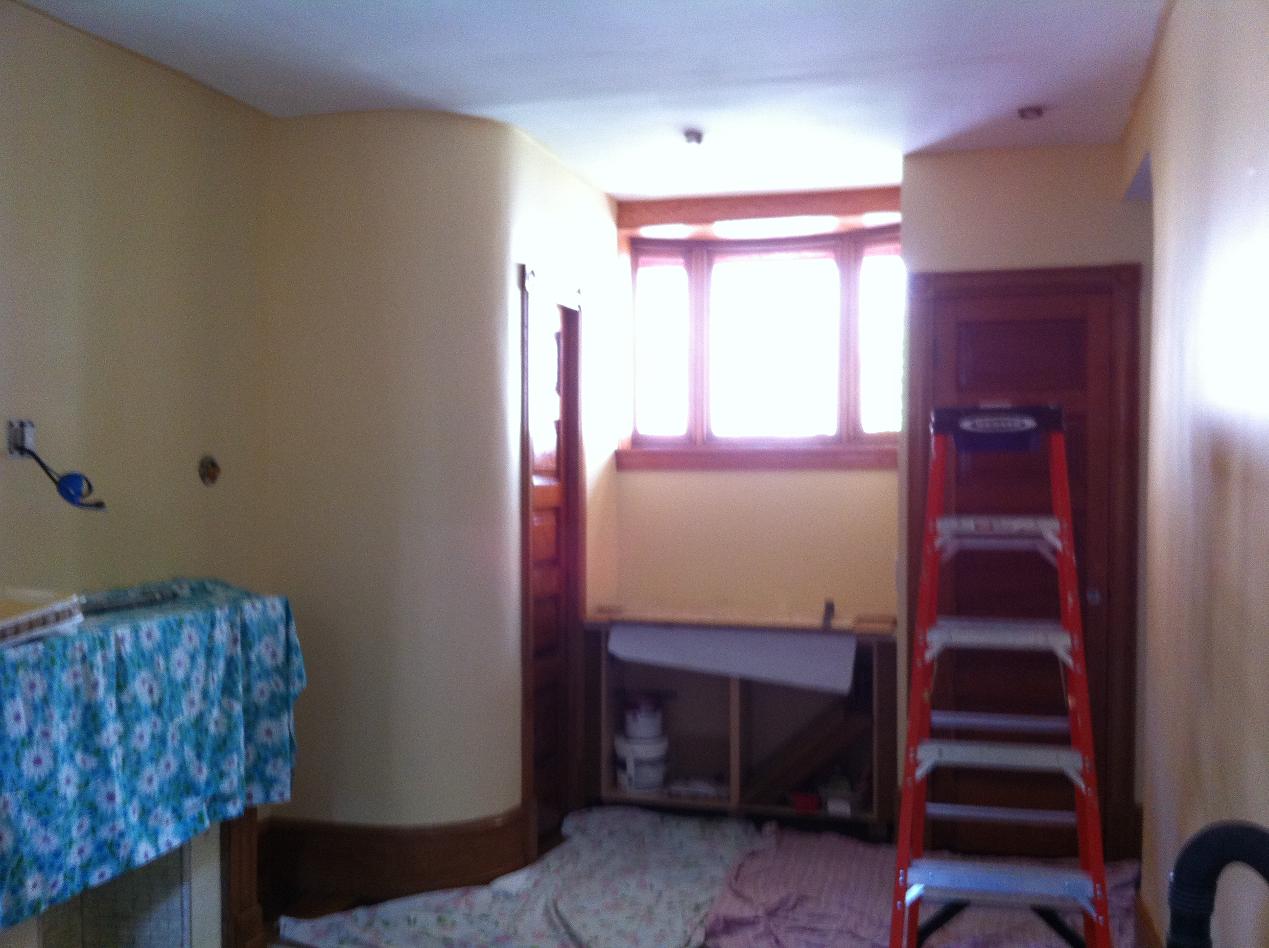 On the exterior, this was the before. We knew something was once there because the frames were still intact on the outside- the openings were simply plywooded over and painted. It’s good that the previous owners did not take the effort to completely remove it. Based on how it was covered over on the interior with an old-school version of drywall, we think the glass from this window and a few others were removed in the 1960’s. Other work done around that time: the installation of some useful but ill-placed closets in two of the bedrooms and the living room. (Which we have removed and reconfigured… sorry, 1960’s.)
