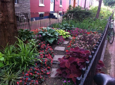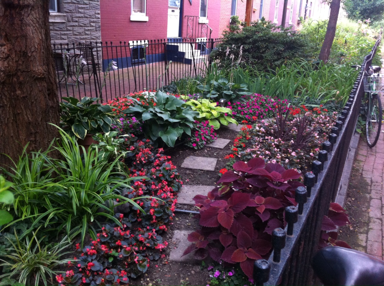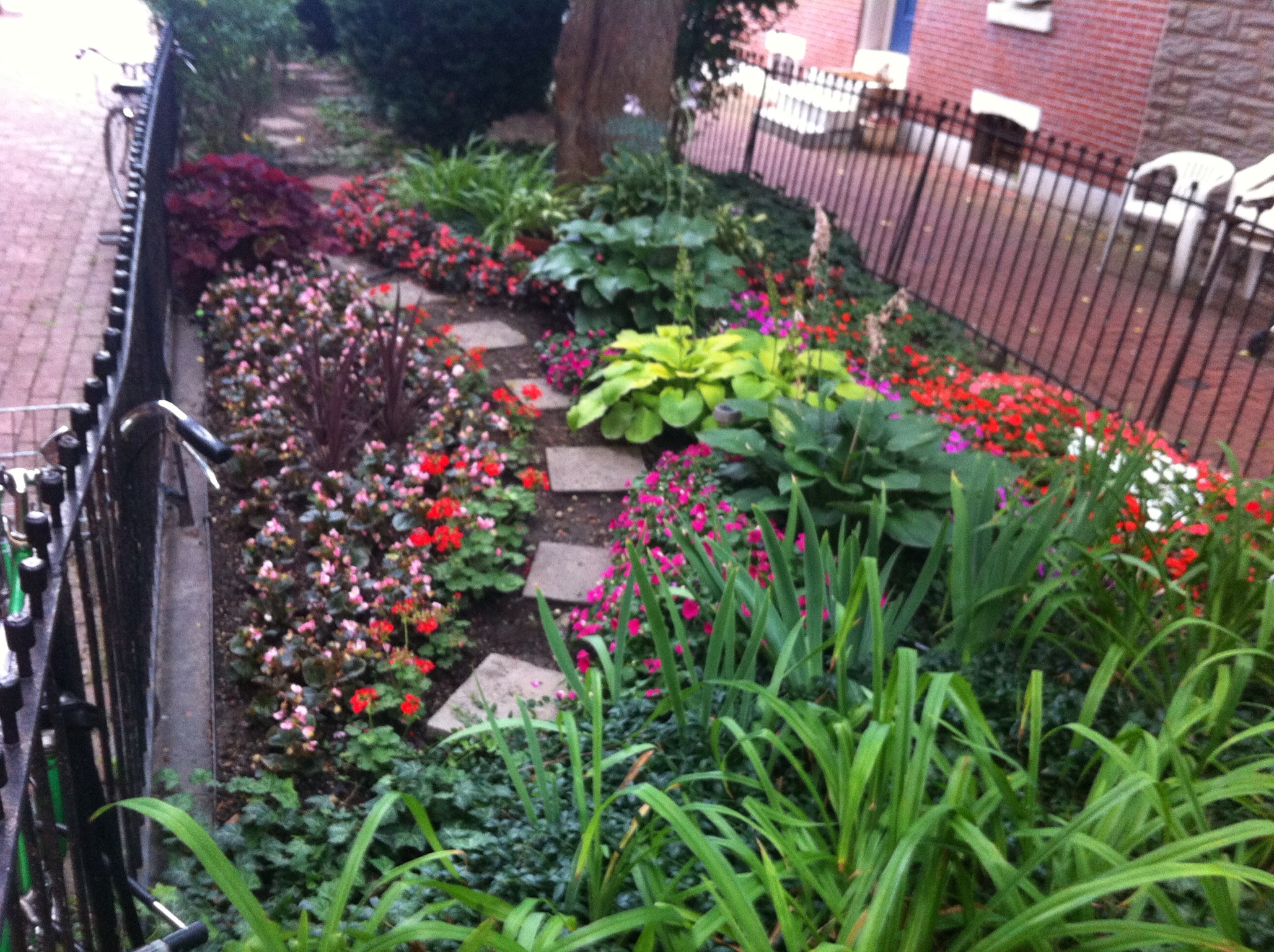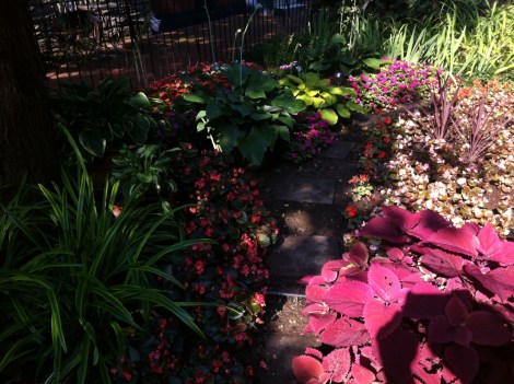 The transplanted Hosta is doing well, the Coleus is giant, the Wax Begonias are growing, the Geraniums are blooming, and the Impatiens are growing wild.