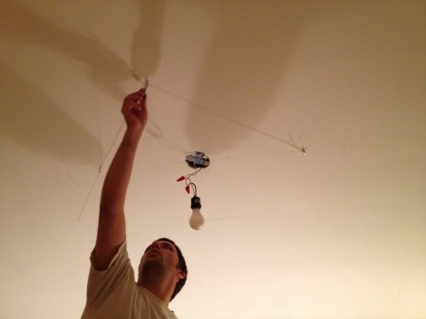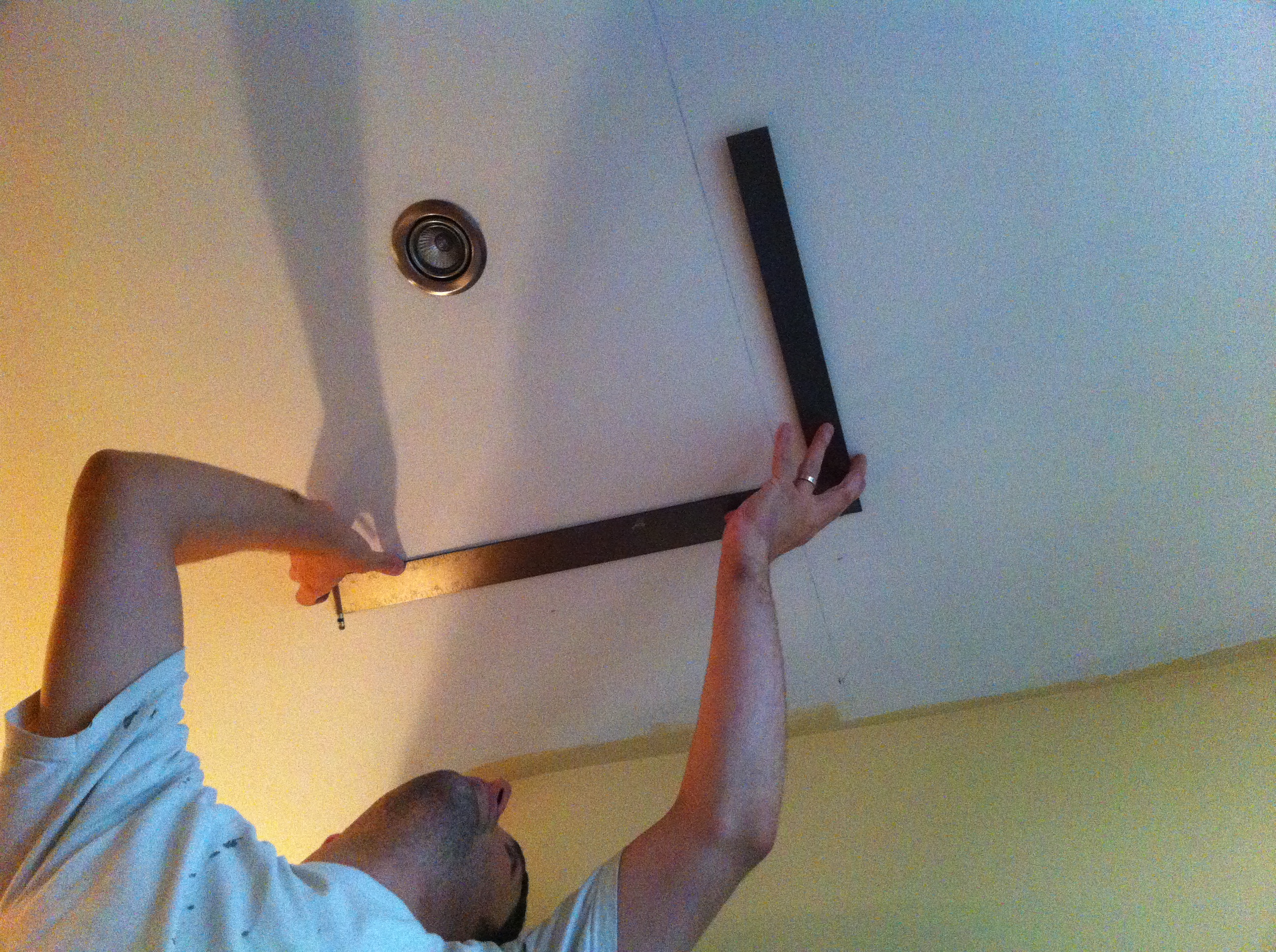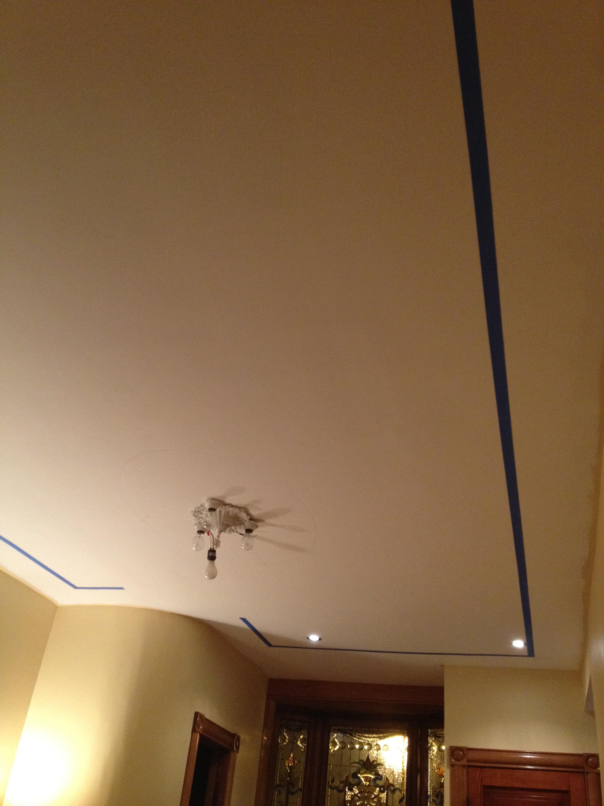 We decided we wanted to paint an ellipse around the center ceiling fixture as well… But how do you paint an ellipse? First you have to draw it, and Rob found a great tutorial online for a ‘Gardener’s ellipse’. To quickly recap, first decide on the Length and Width, and mark them out. Then take half the length, and draw two points on the length line at that distance from the top of the ellipse.