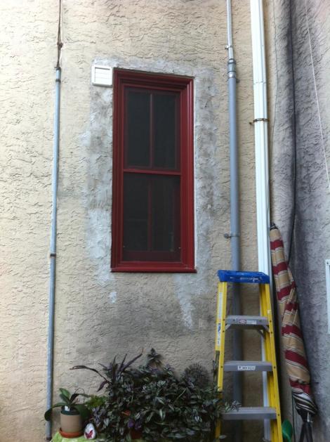 We also finally got our bathroom exhaust vent back in and caulked around the window with tan silicon that blends in nicely. Our neighbors have been very accommodating letting us install and work on this window from their yard!