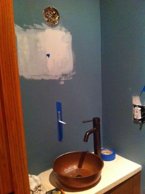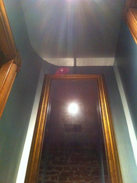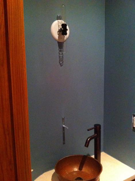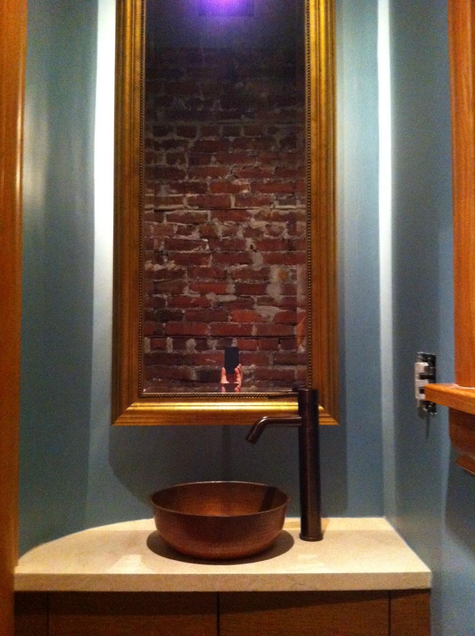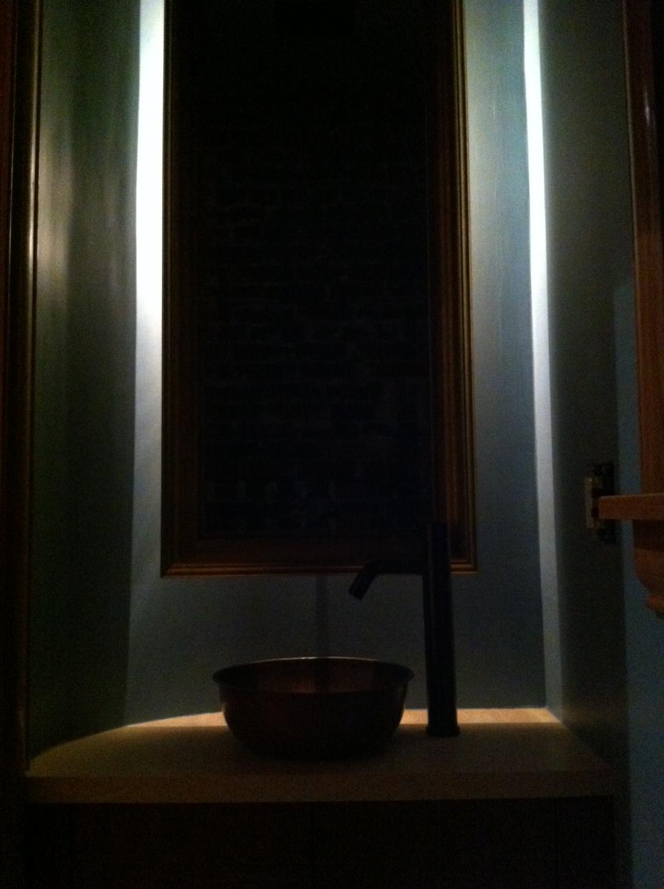 One of our original ideas for the half bath was to mount a mirror off of the wall and install a light behind to illuminate all sides and to wash light across the curved wall.
