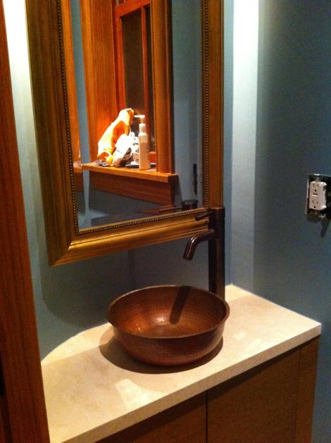 Having a curved wall in the Living Room and Half Bath looks great but has its challenges like how to mount a flat mirror on a curved wall?! Yet it also offers an opportunity to be creative with both the mirror and lighting.