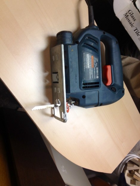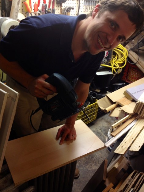The jig saw showdown went something like this…. 1) Borrow jig saw from West Philly Tool Library. 2) Trace interior curve of half bath cabinet onto cardboard. 3) Transfer to shelf. 4) go to basement.