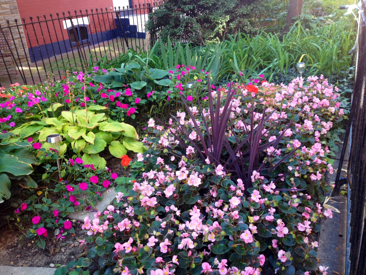 Begonias (light pink) love this weather, and while the impatiens and hosta don’t care for it quite as much, they’re still holding their own, for now: