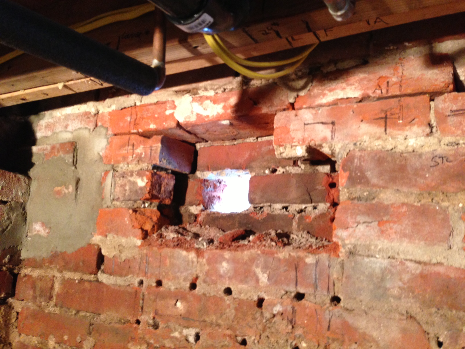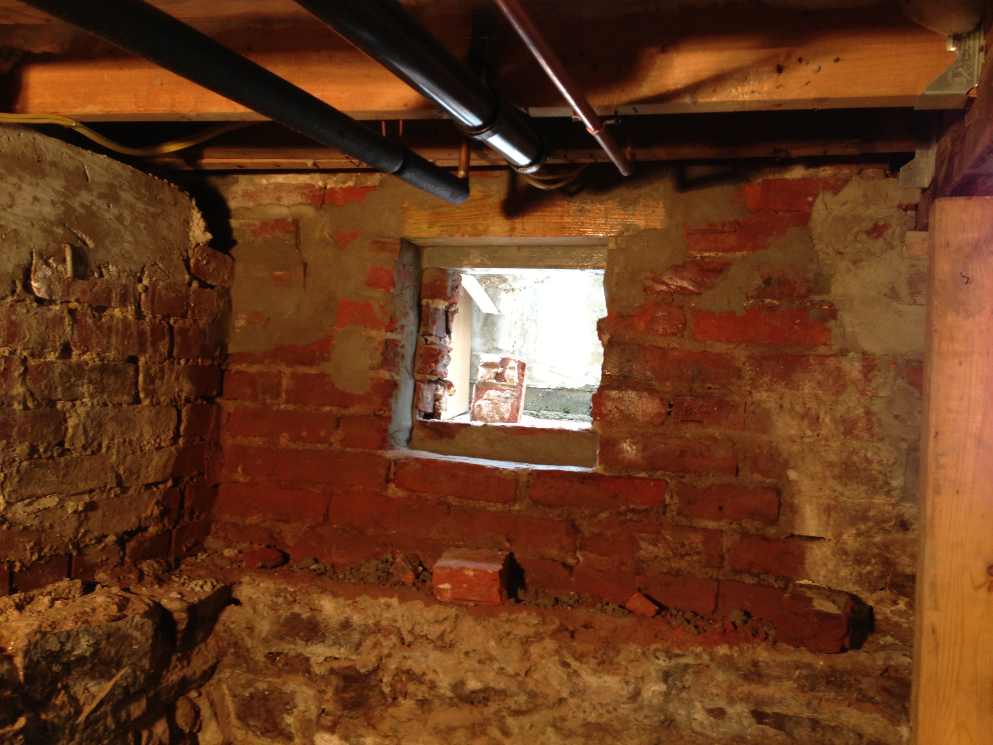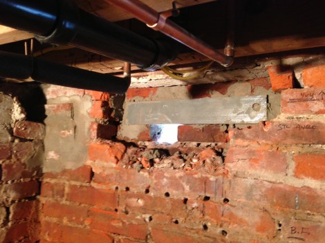 Since we don’t want our house to fall down (especially since this opening is near the basement window and below the chimney), we installed a steel angle lintel, primed and painted for good measure, in the outer brick wythe.