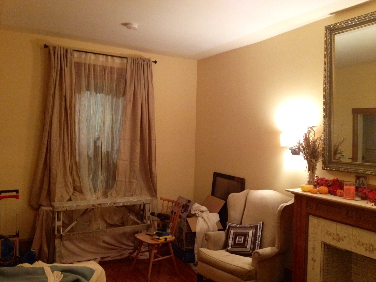 So we hung the new double curtain rod, and here’s the curtain/ sheers mock-up (still needs hemmed):