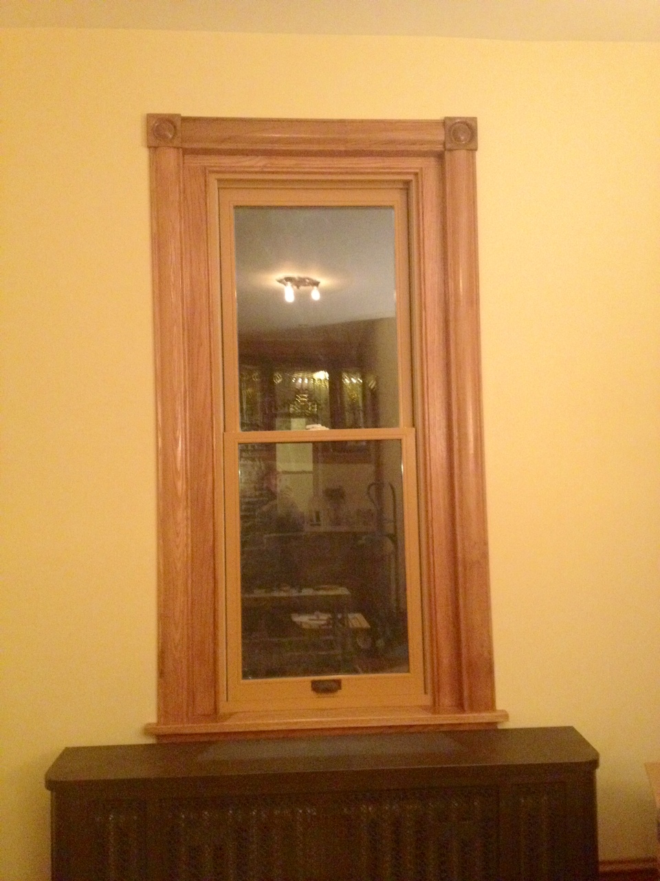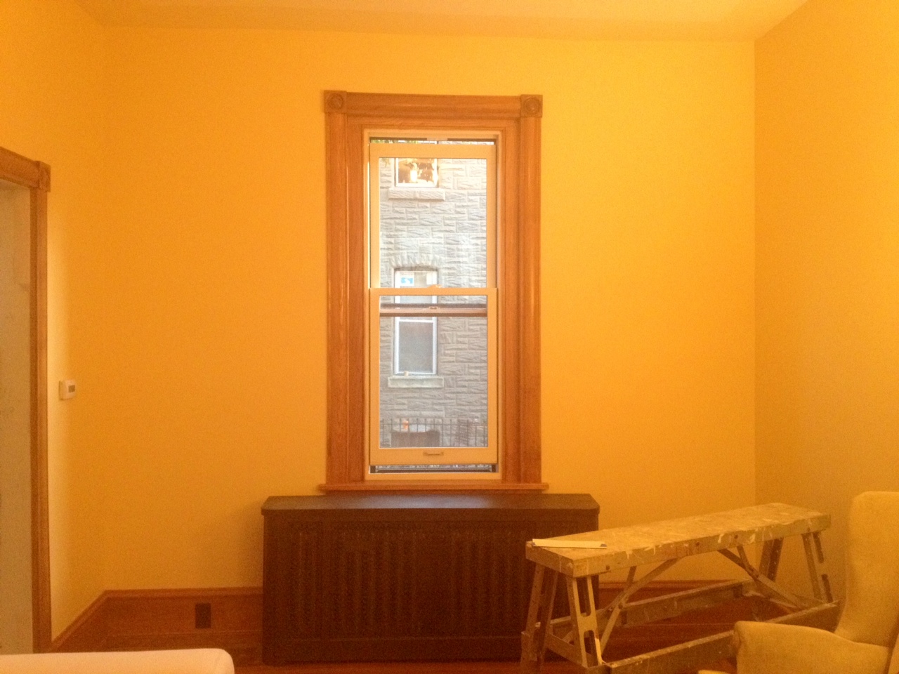 We’re hosting our first Madison Square Thanksgiving for our families in just 5 days, and believe it or not there’s a lot on our to-do list besides grocery shopping. For instance, finish up the living room window details. New stained oak trim, but existing painted white window. The radiator cover below the window was white too – we painted it over the summer but never really blogged about. So here’s the sneak peek of that:
