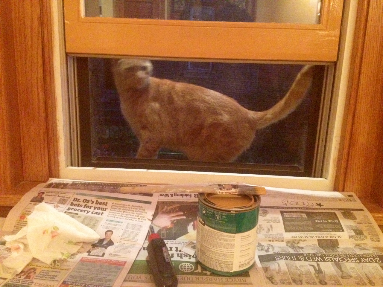 After the cat inspection, which lasted a few minutes and involved some suggestions like, ‘why not paint some mice and birds on that?’, I was able to finish up. These photo make it look a bit orange. Paint not cat.