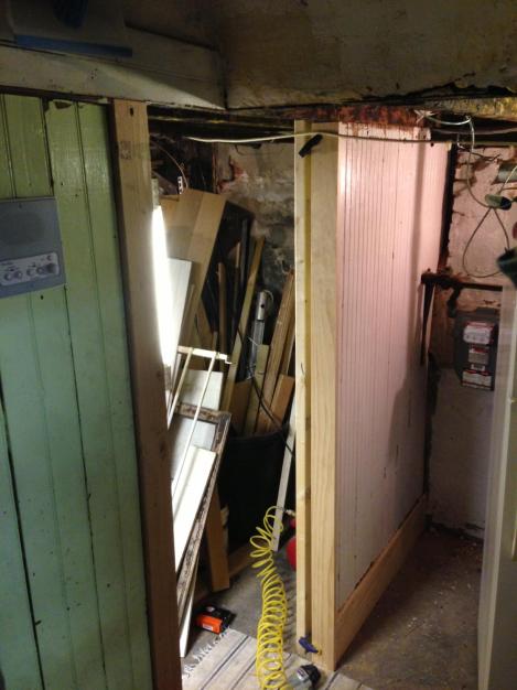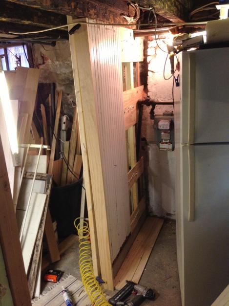 We are using original tong & groove wood paneling that we salvaged when remodeling our 2nd floor bathroom. It’s a perfect project to use some of it and it will go with the original bead board at the basement stair on the other side of the new door.