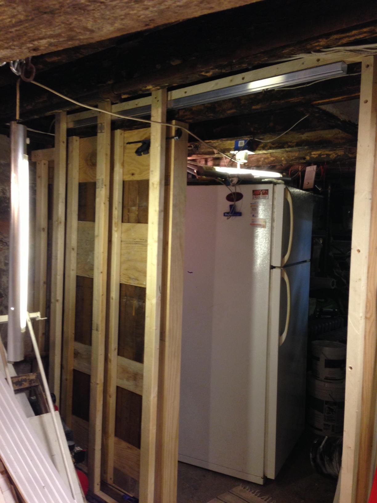 We put strips of scrap plywood across the stud framing so that we can now installing wood paneling.