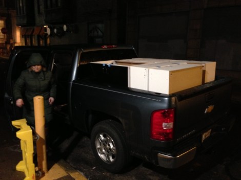 And of course it started to rain but two truck loads later we had all the cabinets home and loaded our coworker up with his cabinets.