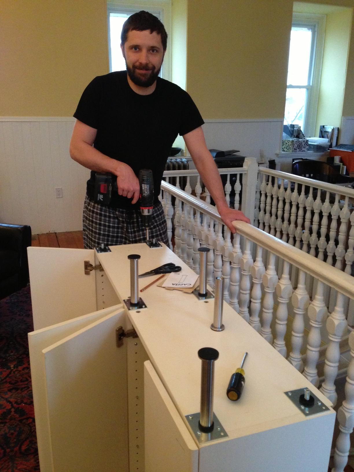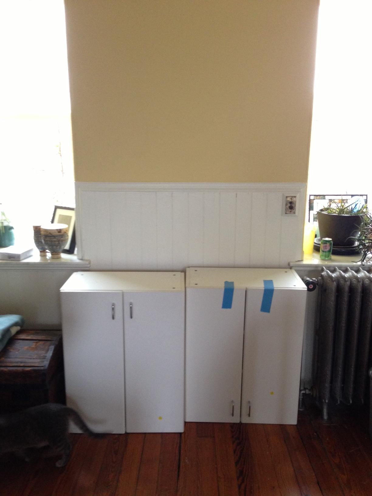 We then bought 2 packs of 6″ Ikea legs to go with our free cabinets. We screwed the two cabinets together, attached the legs, and drilled holes in the back and between the cabinets for all the wires and hoses.