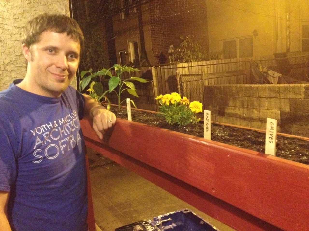 To keep the plants happy we ran a soaker hose, on a timer, the length of the planter box, and a plastic tube comes off of the end of the hose to water our tomato. Kelly also made some cute name tags out of scrap wood.