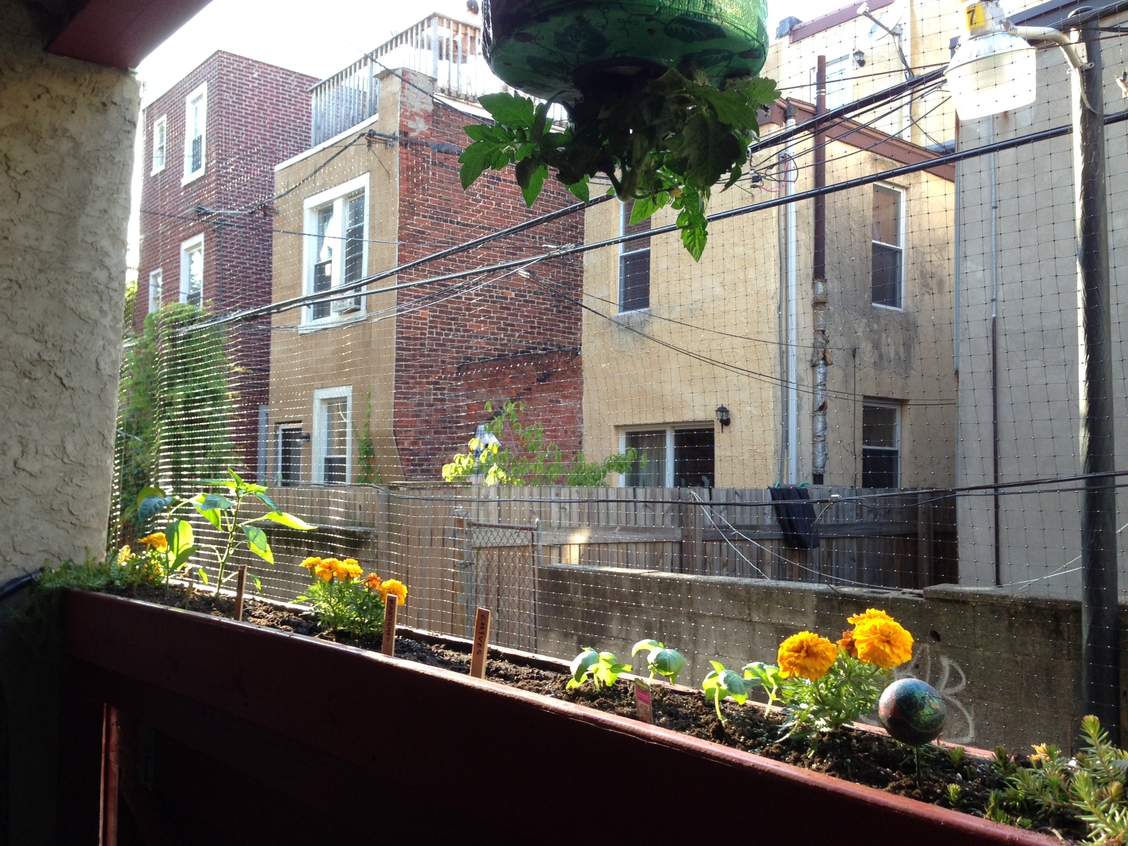 You can also see our upside down tomato plant in the hanging green bag. We mainly tried it because it gives the tomato more dirt than is in the planter box.