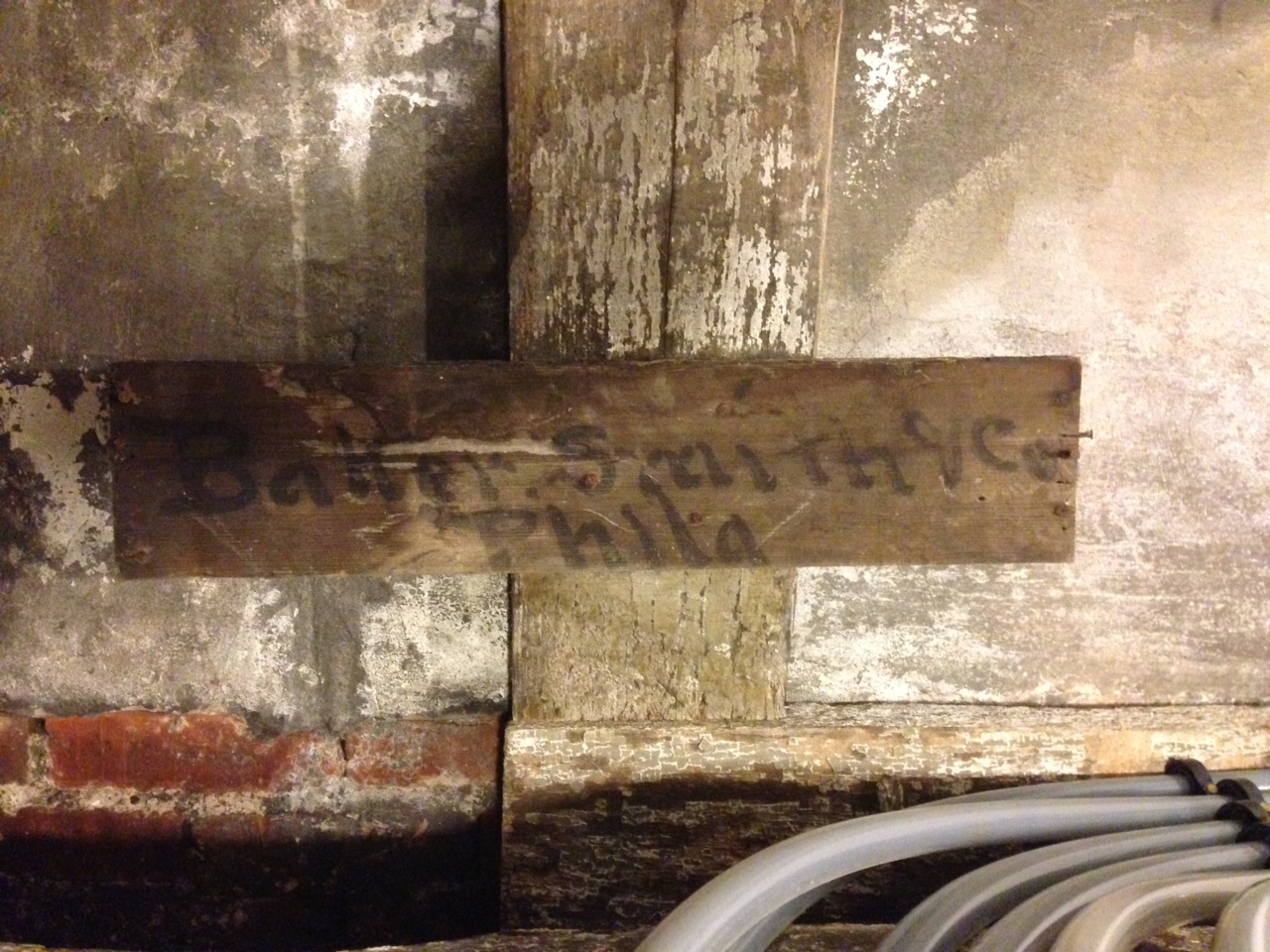 On a side note, in the corner of the basement there is this random board with writing. It’s upside down so I rotated the picture for the ease of reading ‘Baker Smith & Co, Phila.’ Anyone ever hear of this company?