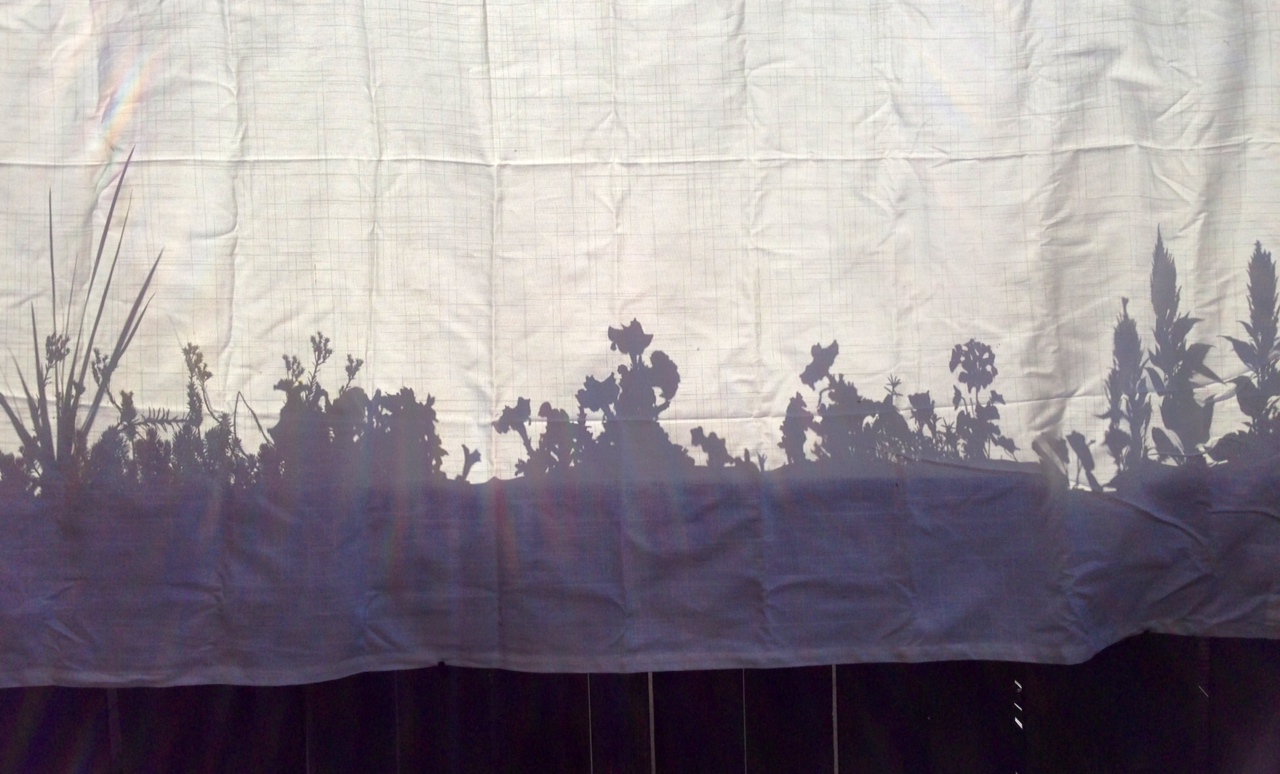 Of course now that it is July, we put up our curtains so we don’t cook from the western exposure. The linen curtain hides some of the plants but the plants remind us they’re still there with their fun shadows.