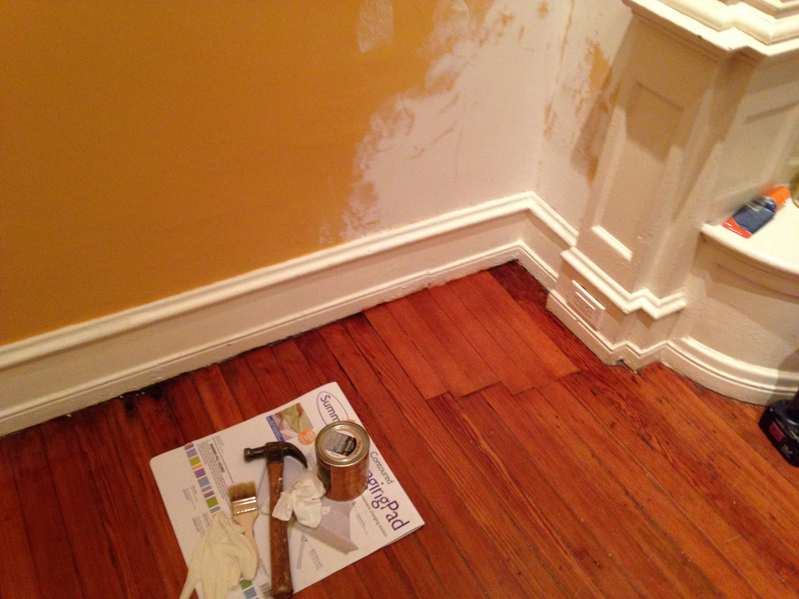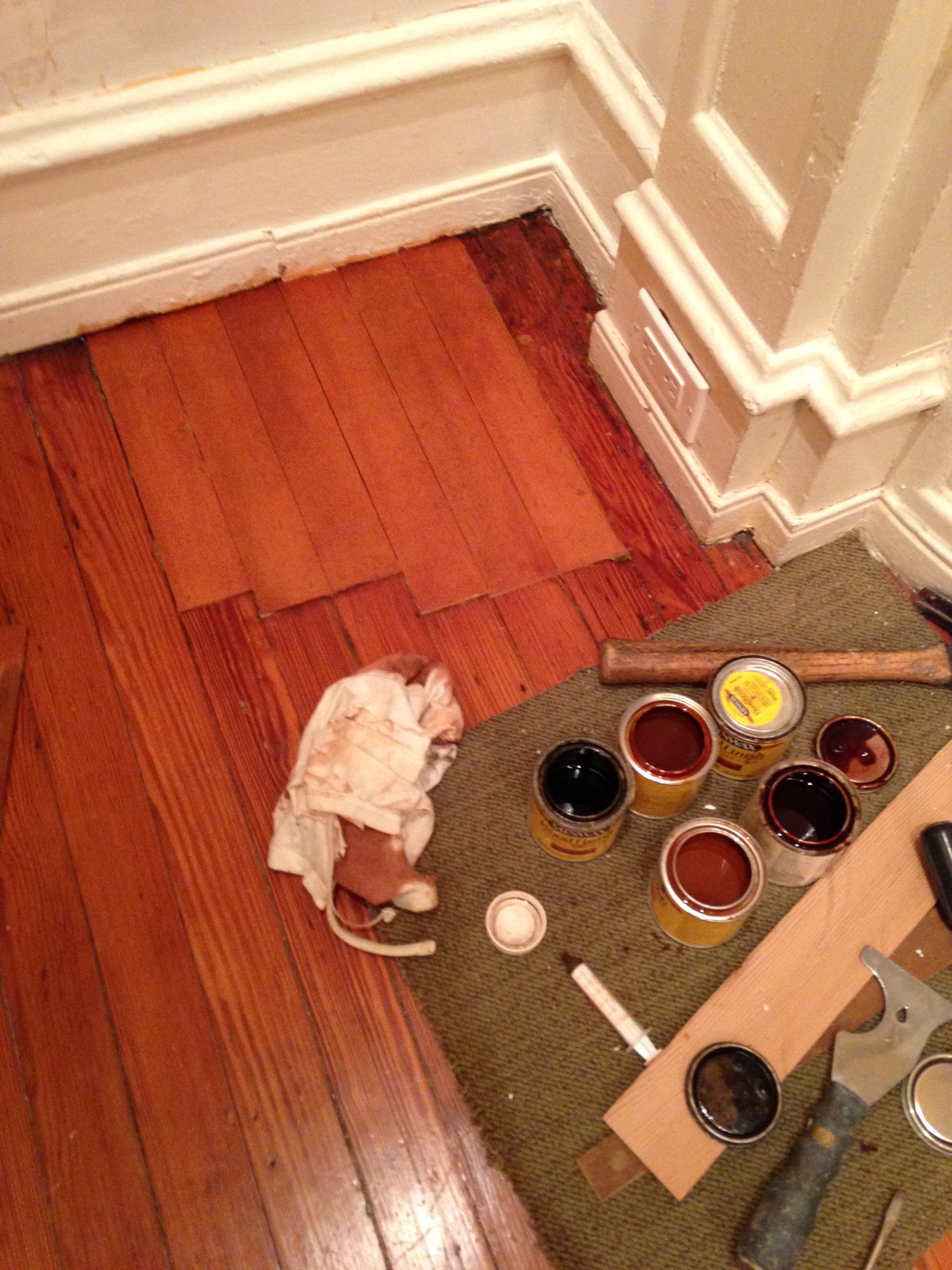After testing a few different stains on scrap wood, we finally attempted the floor (it’s hard to go backwards when staining wood). Here is the first coat of stain and it’s too light. But that’s alright, you can always go darker but not lighter…