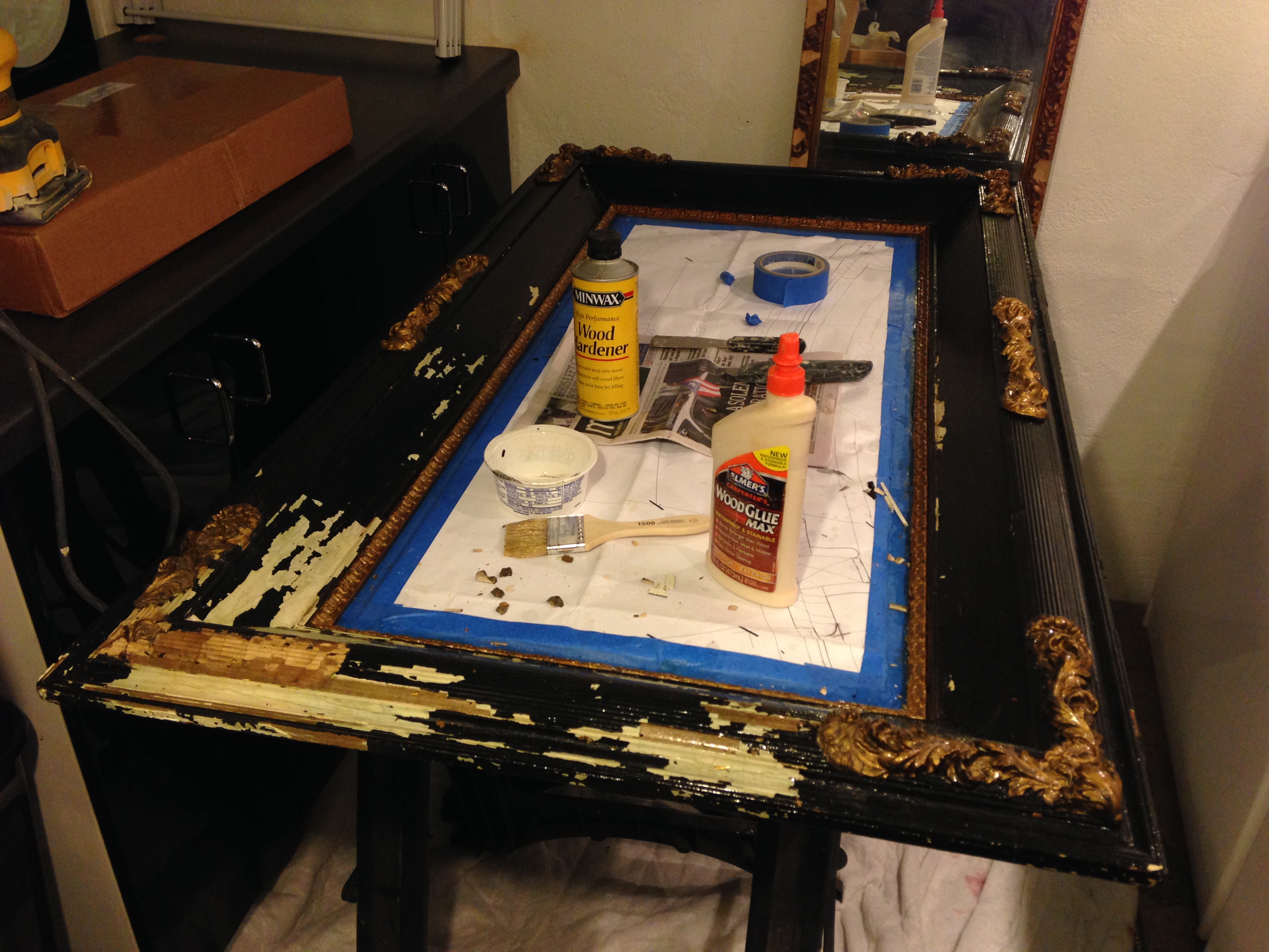 To stabilize it we used a combination of wood hardener and Elmer’s wood glue to stop any more sections from falling off, as well as reattached a few pieces that were dislodged since we have had the mirror.