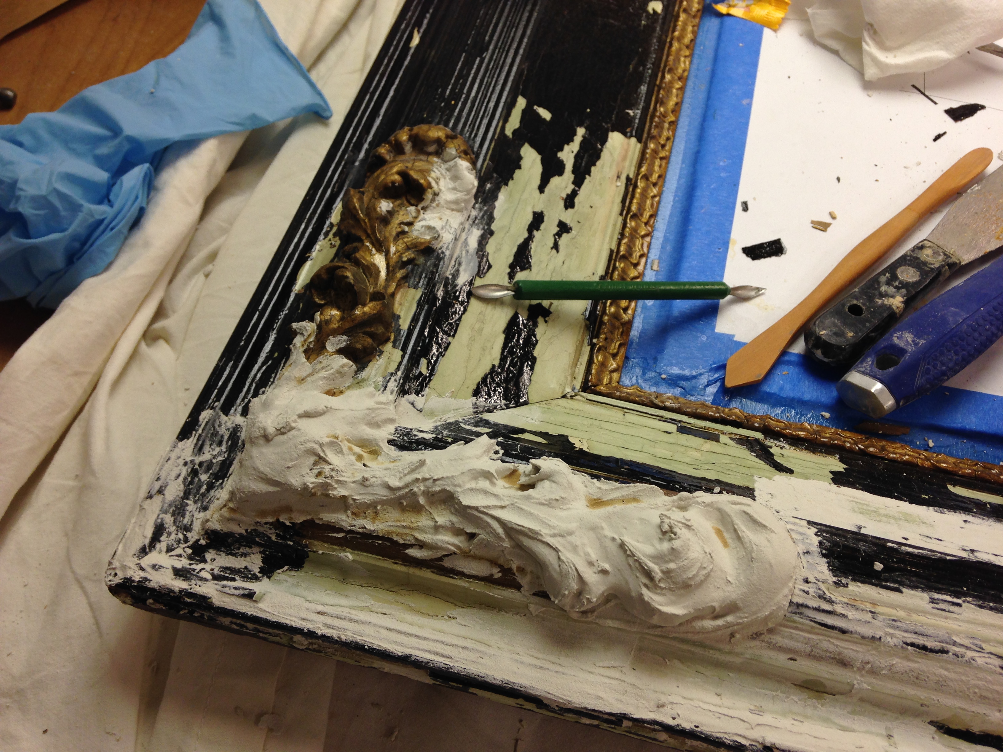 We used plaster to rebuild the missing ornamentation. It was a process to form the rough shape in plaster and then carve out the details once the plaster set.