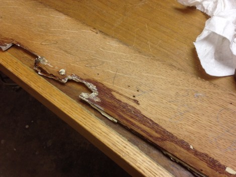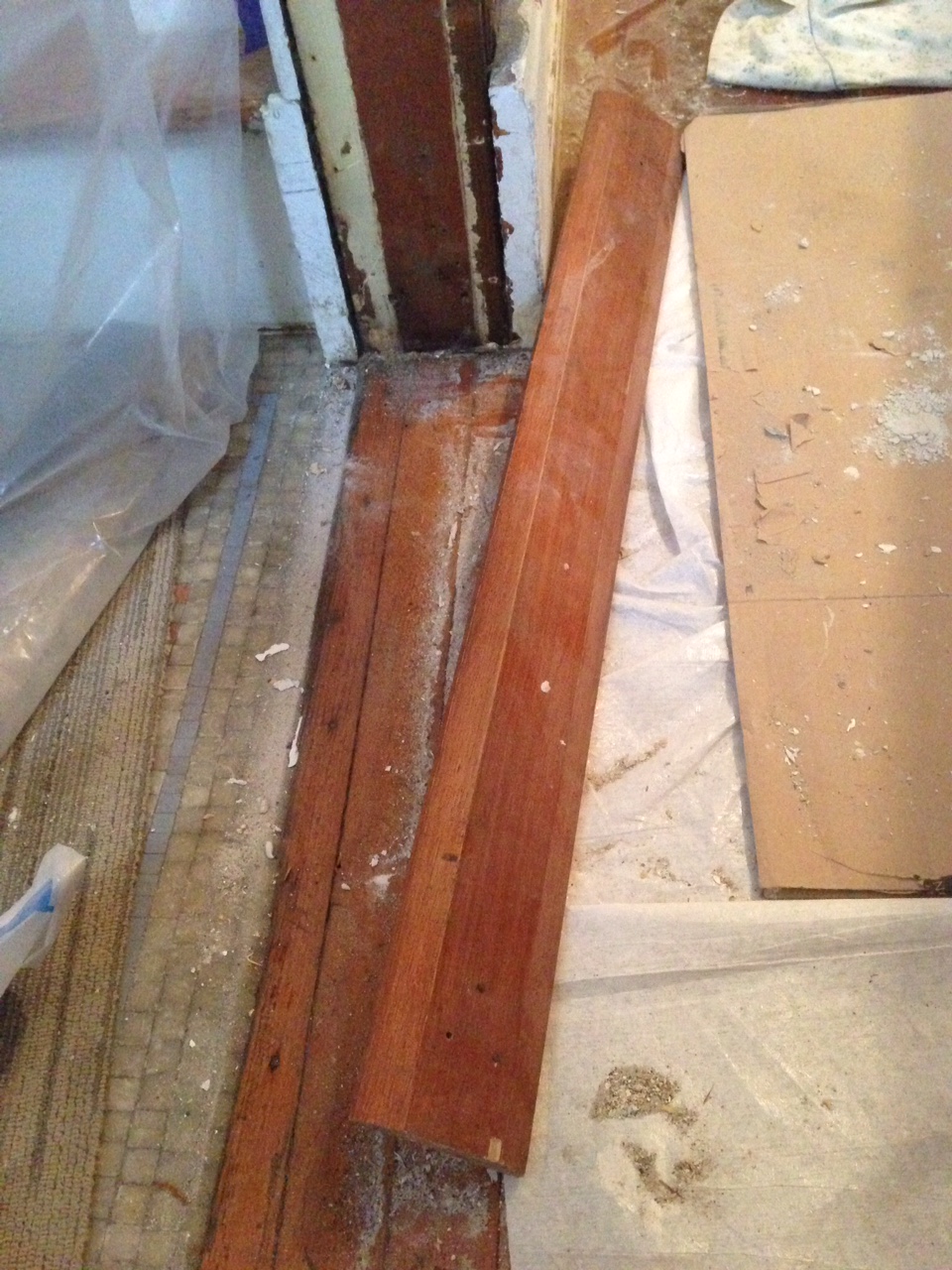 I was able to use old oak that had been demo’ed from door jambs for the missing floor boards. You can see the original carpenter’s writing on the back.
