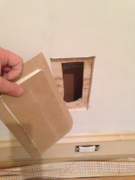It was easiest to cut the new hole in place, thru the base, drywall, and a layer of plywood that we used to stiffen the half wall. Fun